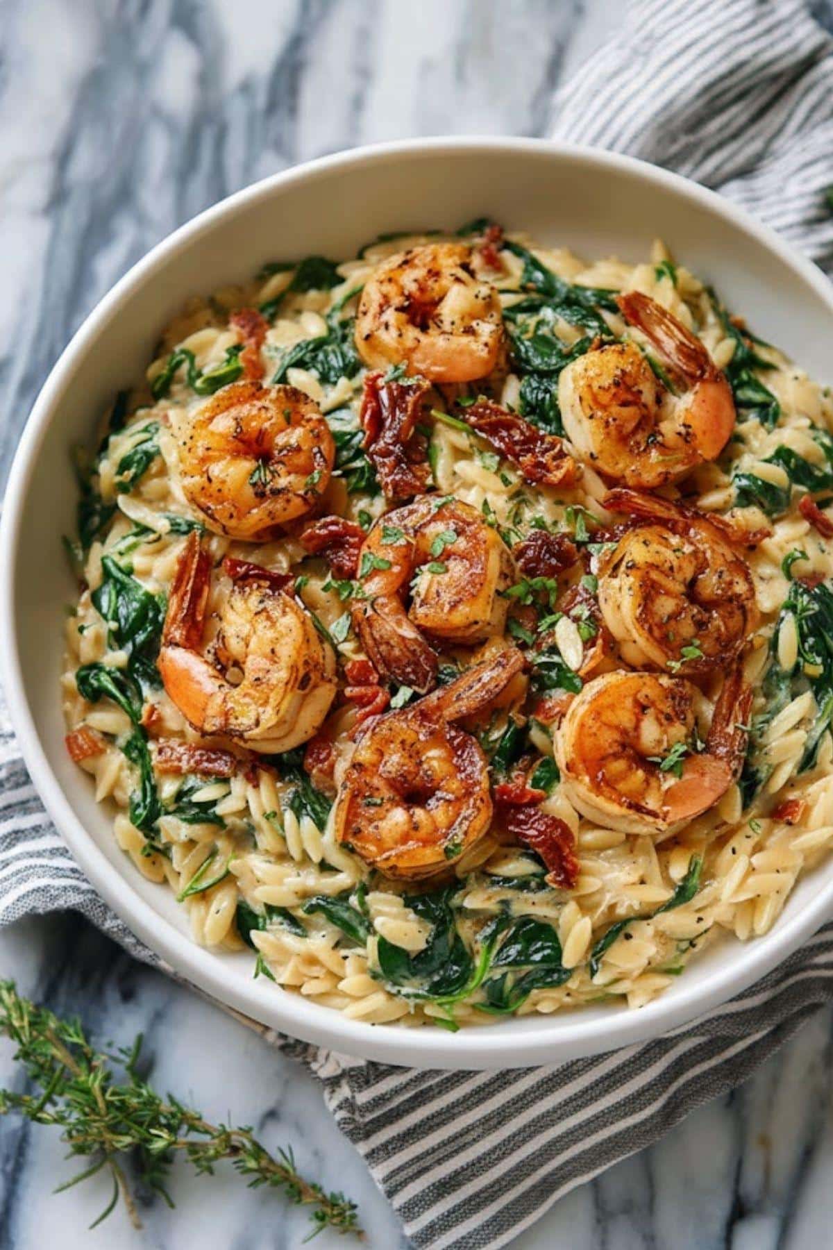 This one-pan wonder tastes like golden hour in Tuscany. Smoky shrimp nestle into creamy orzo with sun-dried tomatoes, artichokes, and wilted spinach.