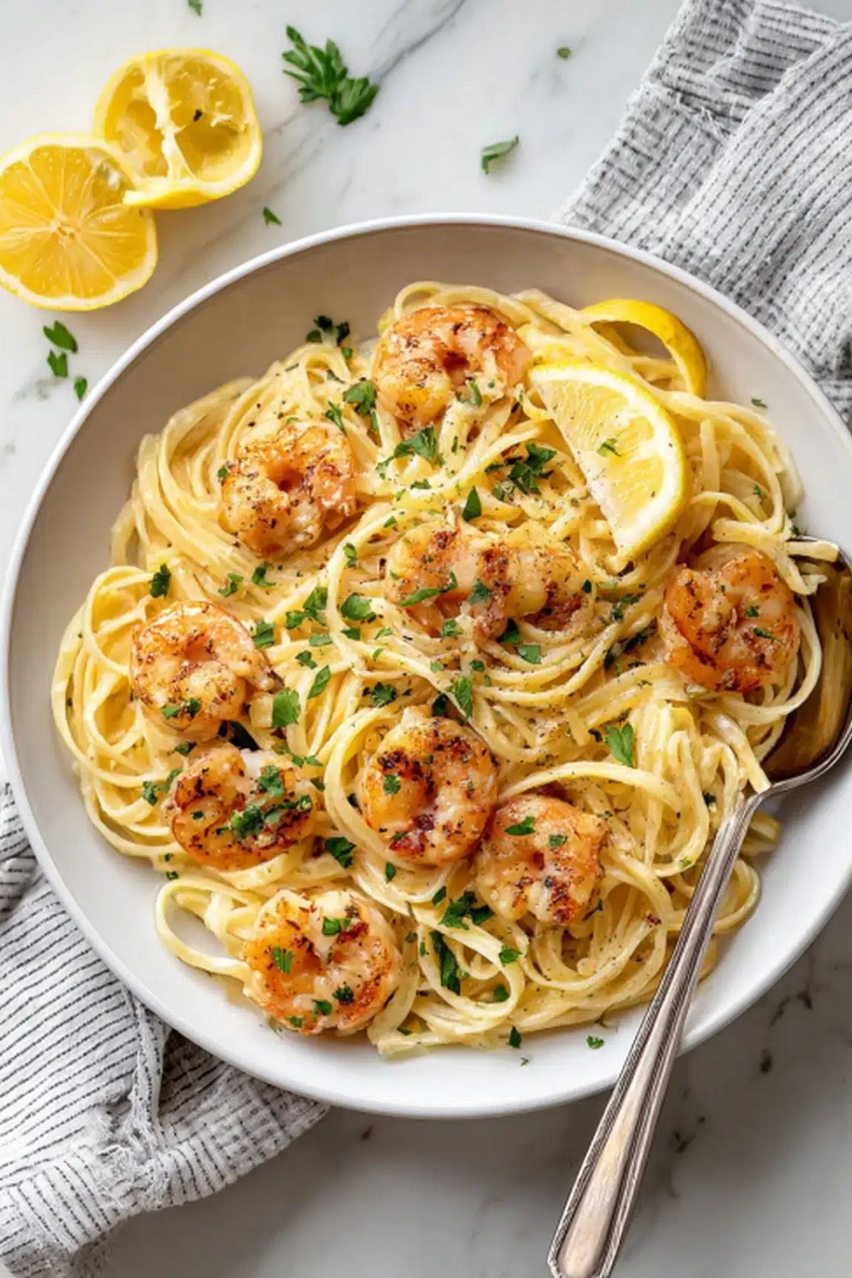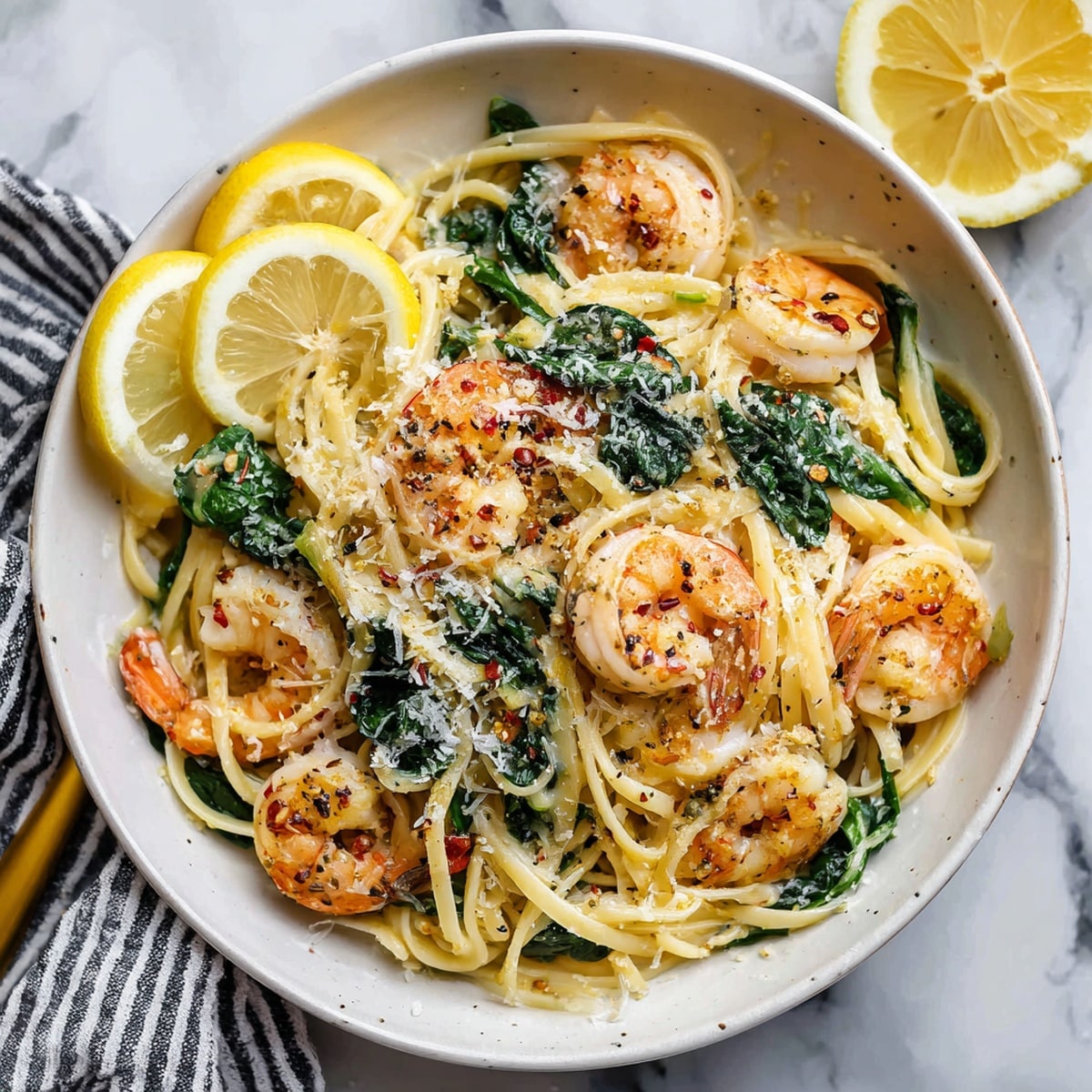 Silky linguine tangled with garlicky shrimp, fresh spinach, and buttery Parmesan. A touch of lemon lifts it all.