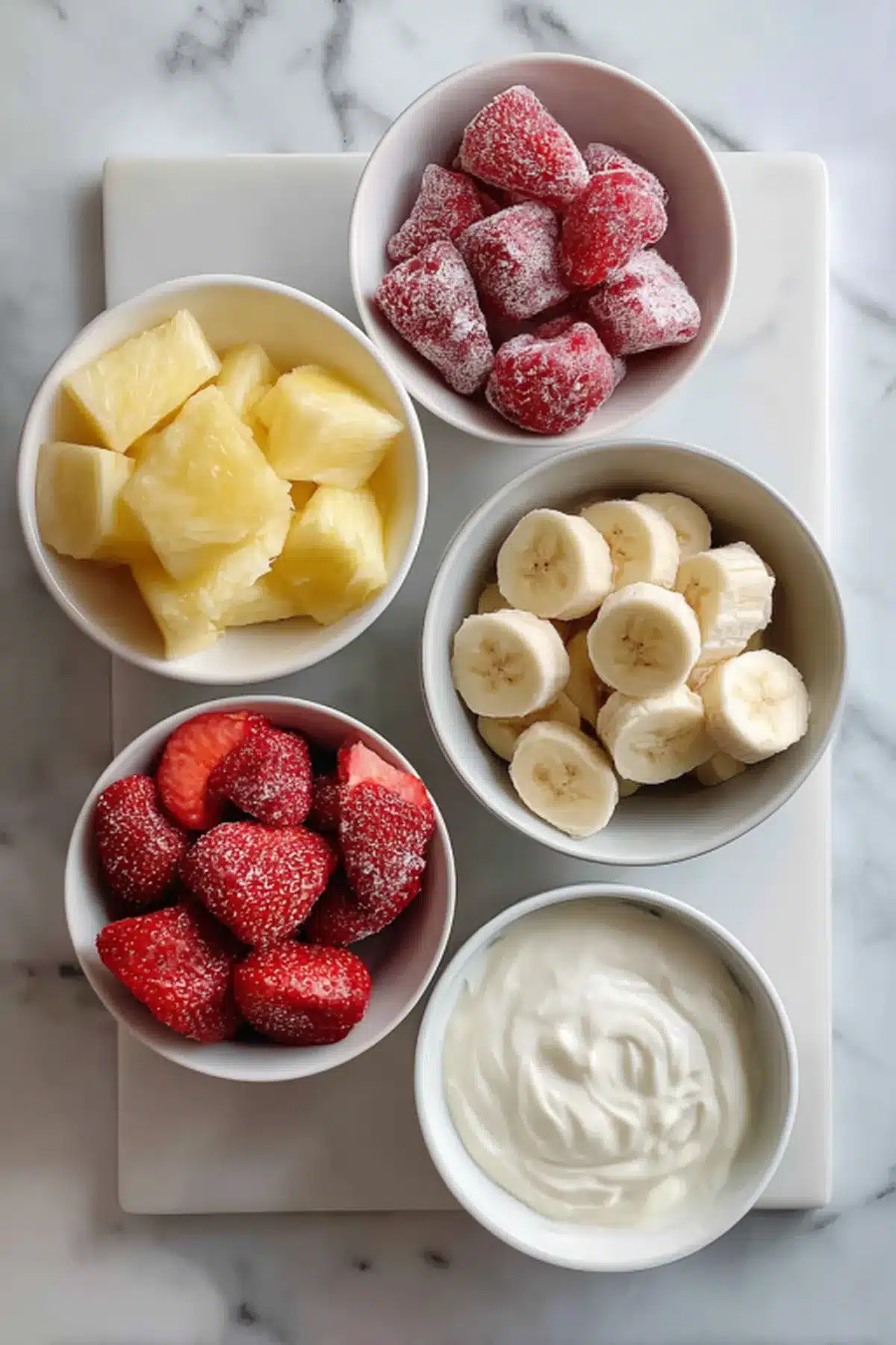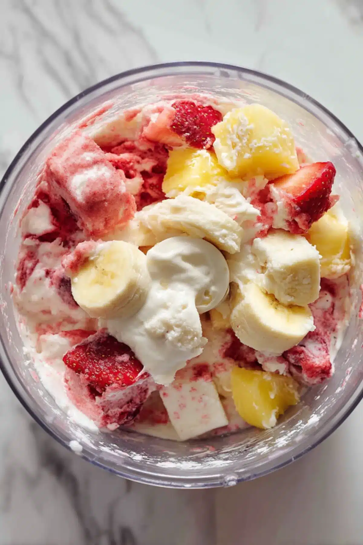 - Add banana, frozen strawberries, pineapple, and Greek yogurt to a high-powered blender or food processor.