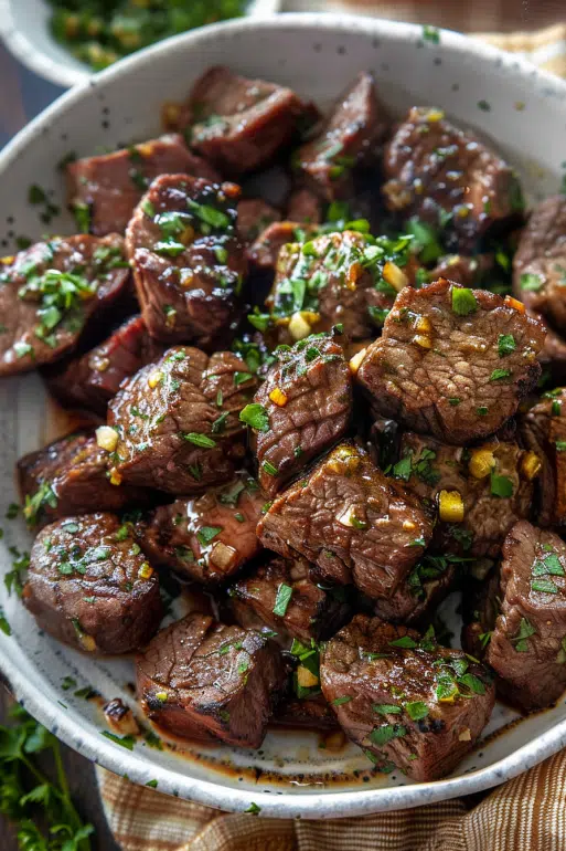 Imagine a cube of steak, seared just enough to get a caramelized crust, then drenched in garlic-slicked butter that glistens like morning dew. The first bite has a savory snap, yielding to tender interior and fragrant garlic warmth and the parsley gives a fresh, green spark.
