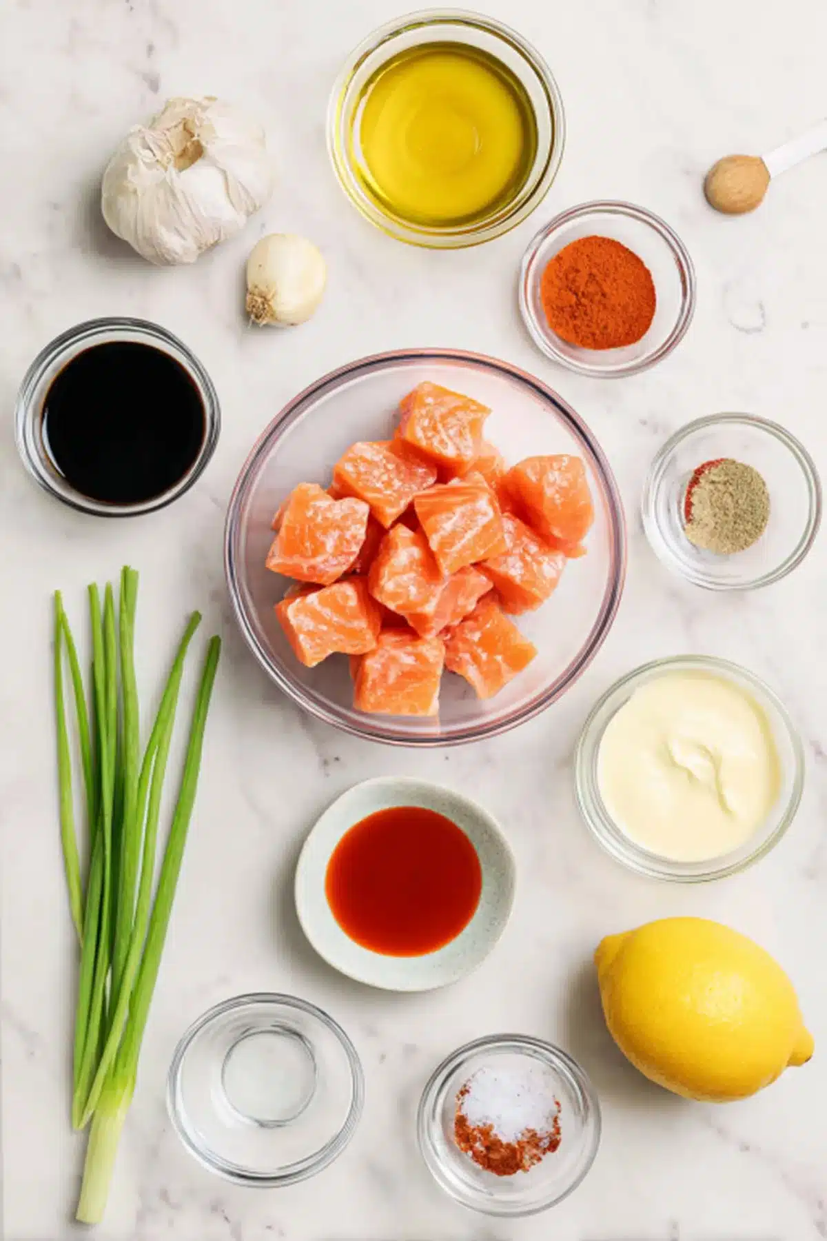 • 1ยฝ-2 lb center-cut salmon filets, skin removed and cut into approximately 1-inch pieces