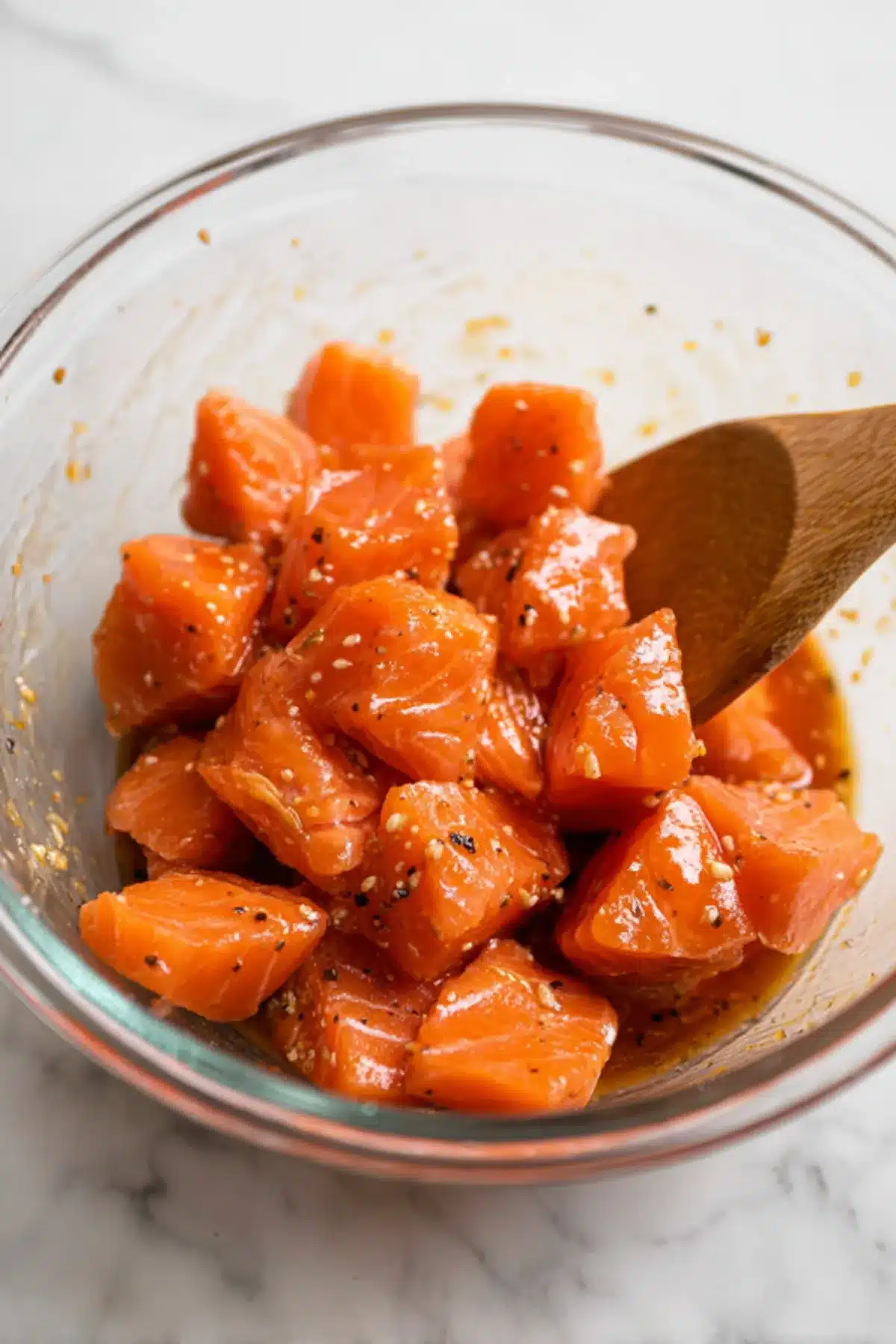 3. Add salmon pieces to the bowl and gently toss until fully coated
