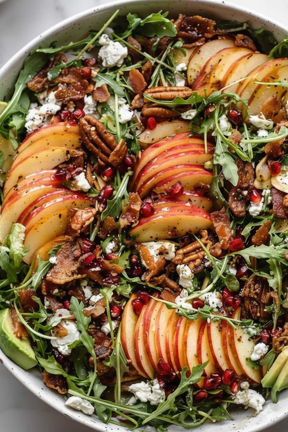 - Layer components (apples, nuts, feta) on top rather than mixing for visual impact.