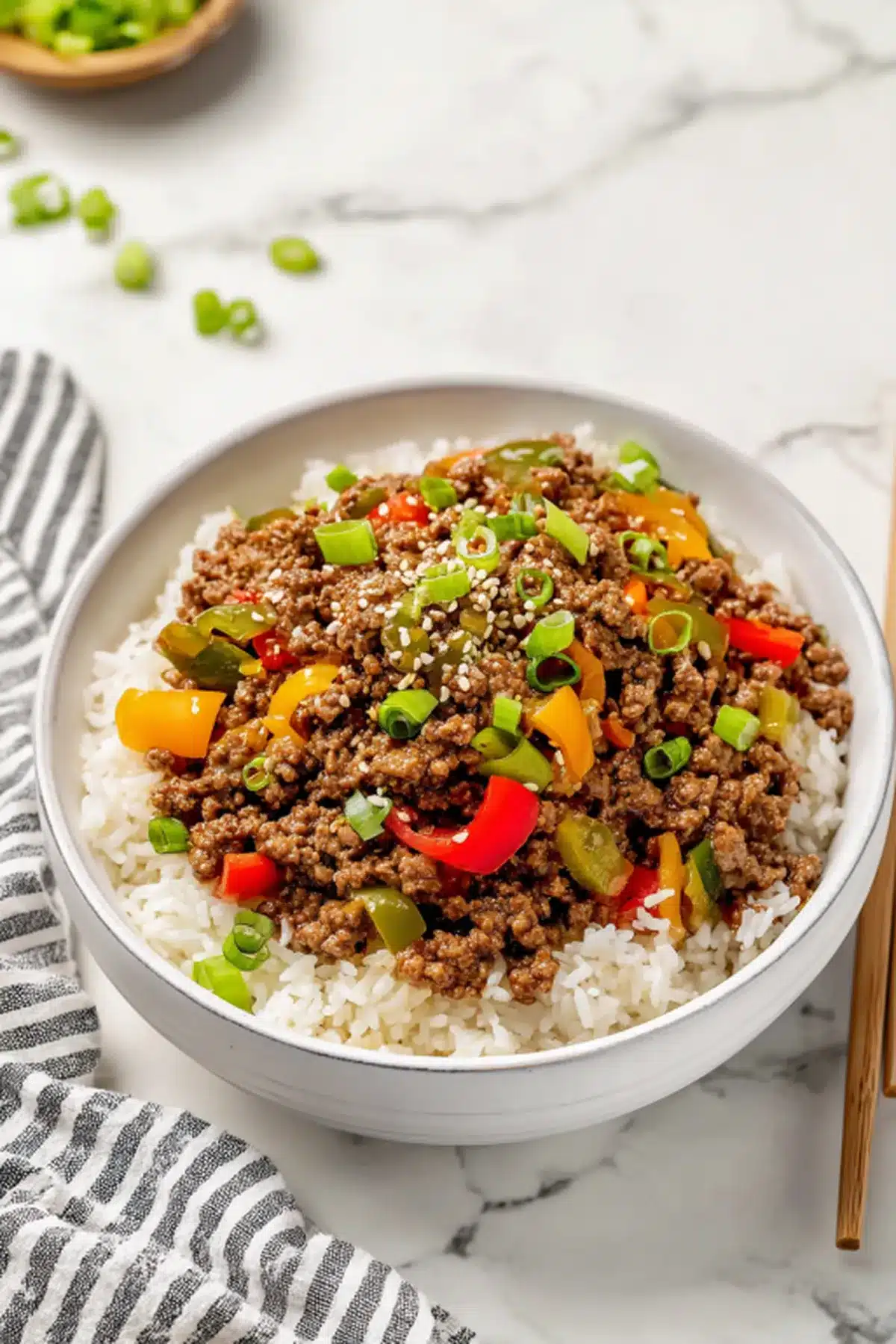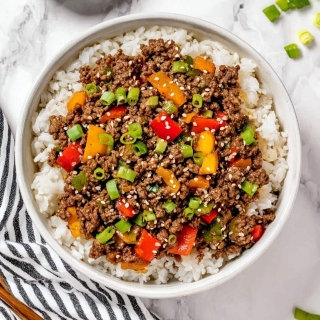 Imagine tender ground beef cooked until caramelized at the edges, mixed with softened peppers that still hold a gentle bite. The sauce soy, hoisin, and a whisper of sriracha wraps everything in savory warmth with just enough sweetness to keep things interesting. Every spoonful hits salty, sweet, spicy, and umami notes all at once.