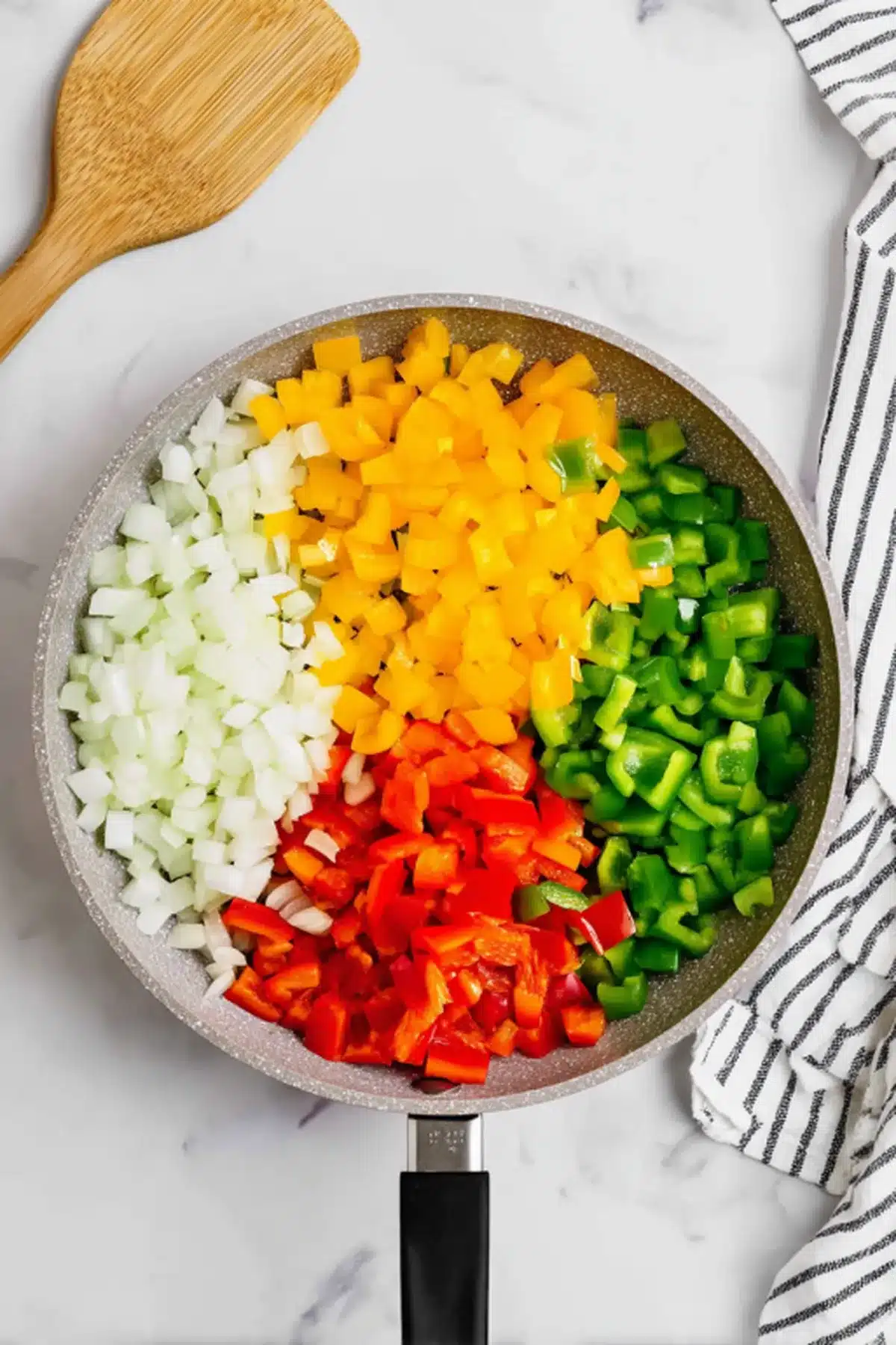 - Add diced onion and bell peppers and cook 5-7 minutes, stirring often until softened and glossy