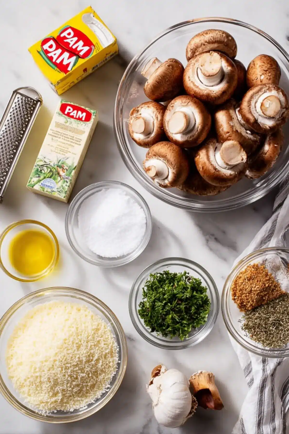 - Preheat and prep: Preheat oven to 400 ยฐF. Grease a baking sheet with cooking spray. Remove stems from mushrooms and finely chop. Arrange caps hollow side up on the tray.