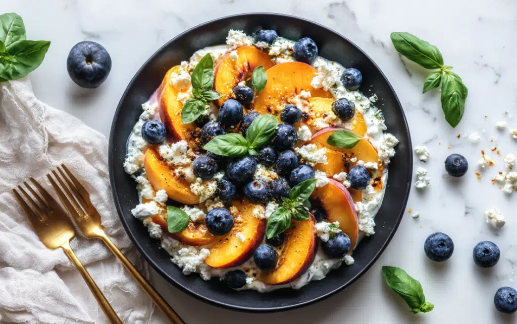 A refreshing summer salad bursting with sweet peaches, juicy blueberries, creamy feta, and crunchy toasted nuts all tied together with a honey-lemon vinaigrette. This easy, no-cook dish is perfect for warm-weather dining.