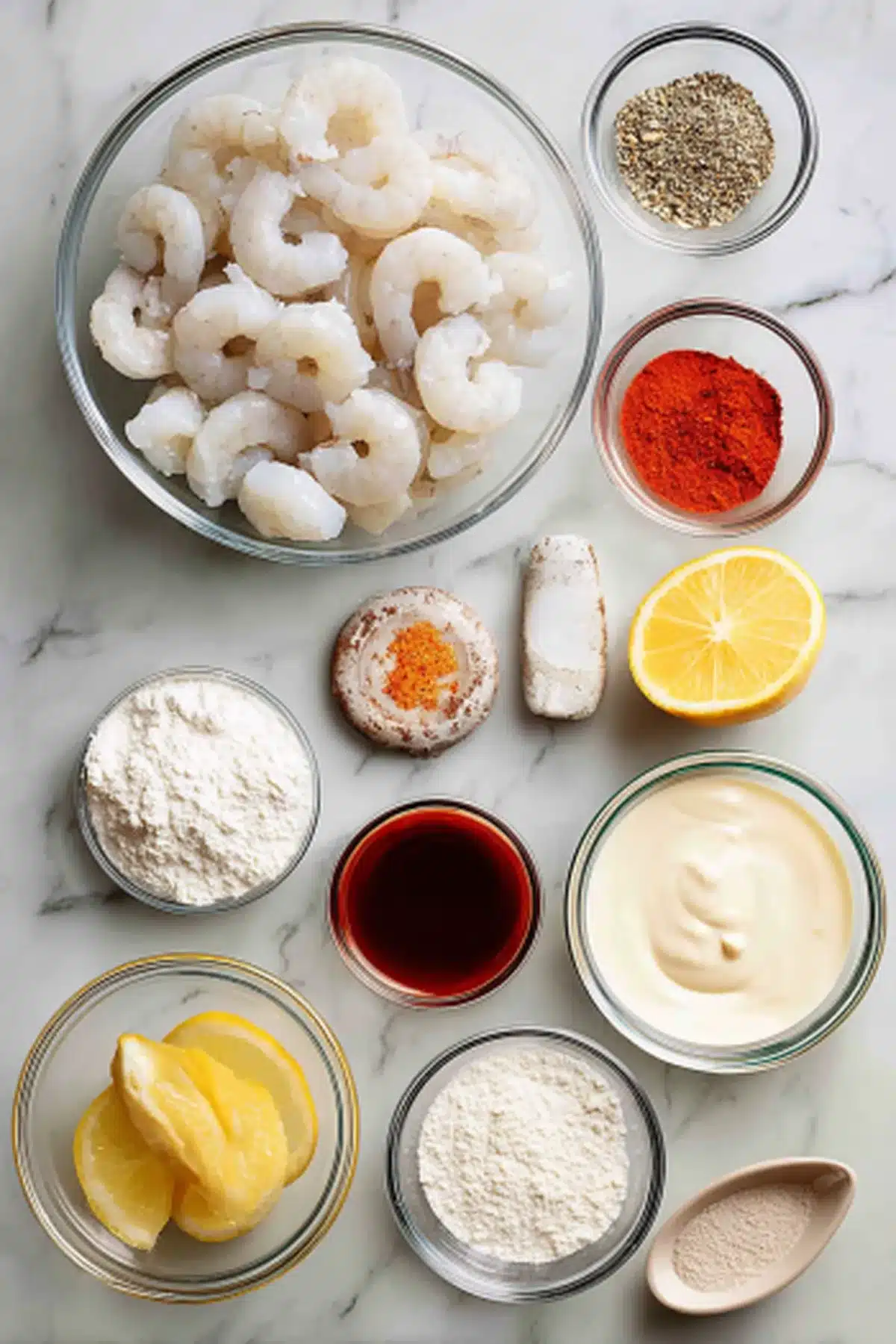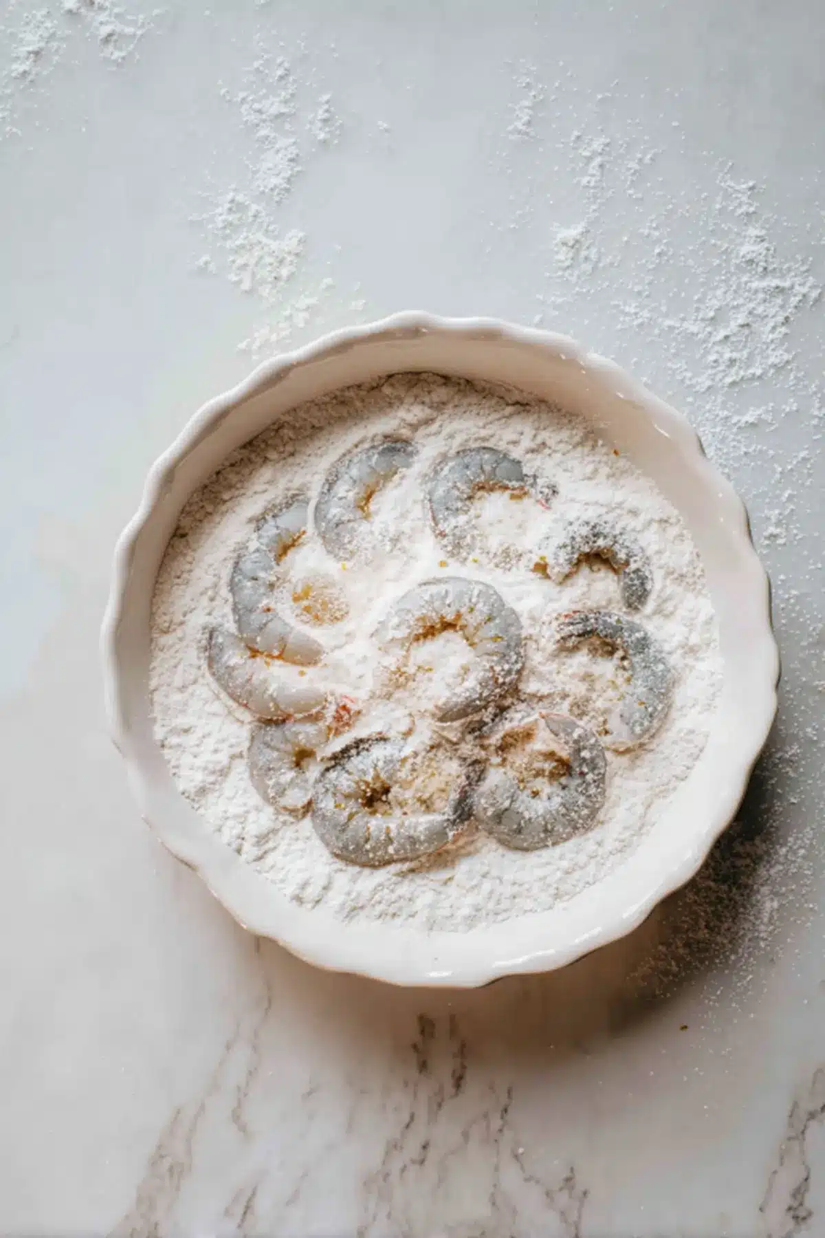 In a second bowl, mix flour, cornstarch, salt, pepper, and paprika. - Coat the Shrimp