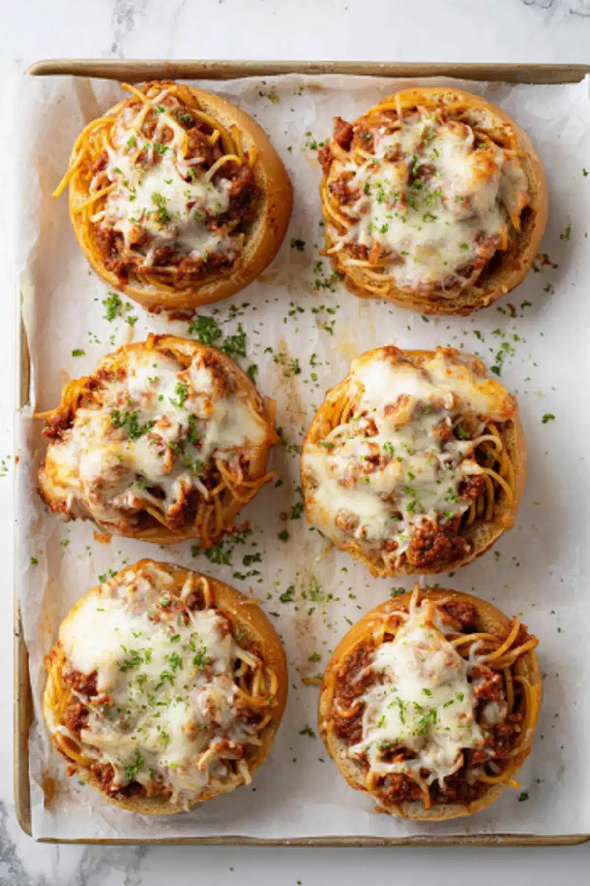 Buttery, garlicky bread with crispy edges gives way to saucy spaghetti and gooey melted mozzarella. The contrast between crunchy crust and tender pasta is pure comfort.