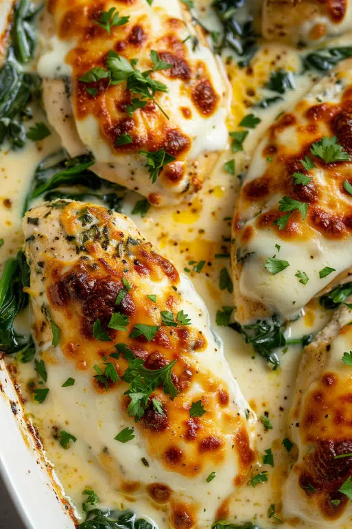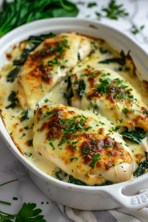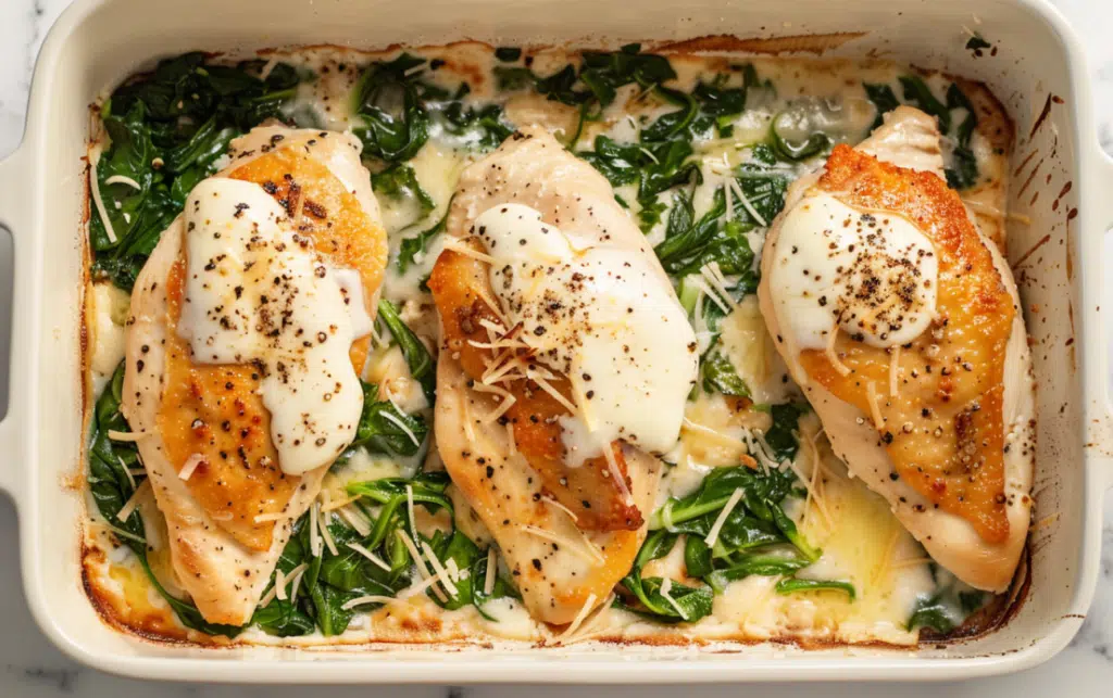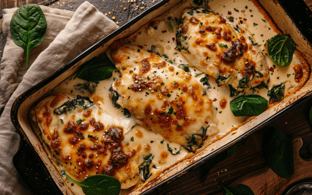 A creamy, cheesy, and savory chicken bake layered with garlic-seasoned chicken breasts, sautéed spinach, and melted mozzarella. Perfect for an easy weeknight dinner or family gathering.