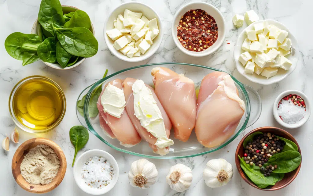 - Assemble - Place chicken in a greased casserole dish. Spread cream cheese evenly over each fillet, top with spinach, then cover with shredded mozzarella.