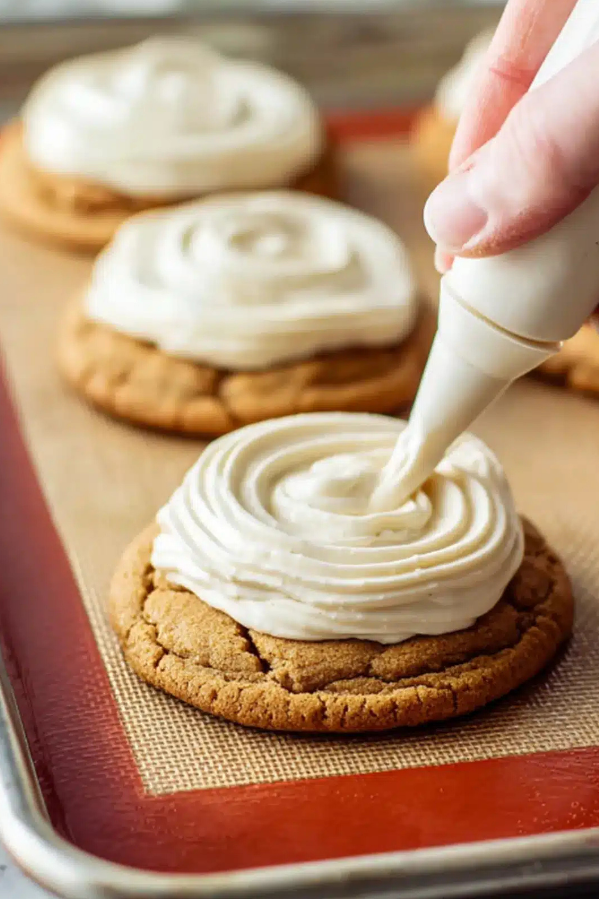 - Pipe onto cooled cookies in a spiral pattern using a large round tip.