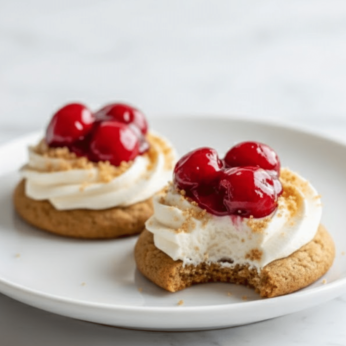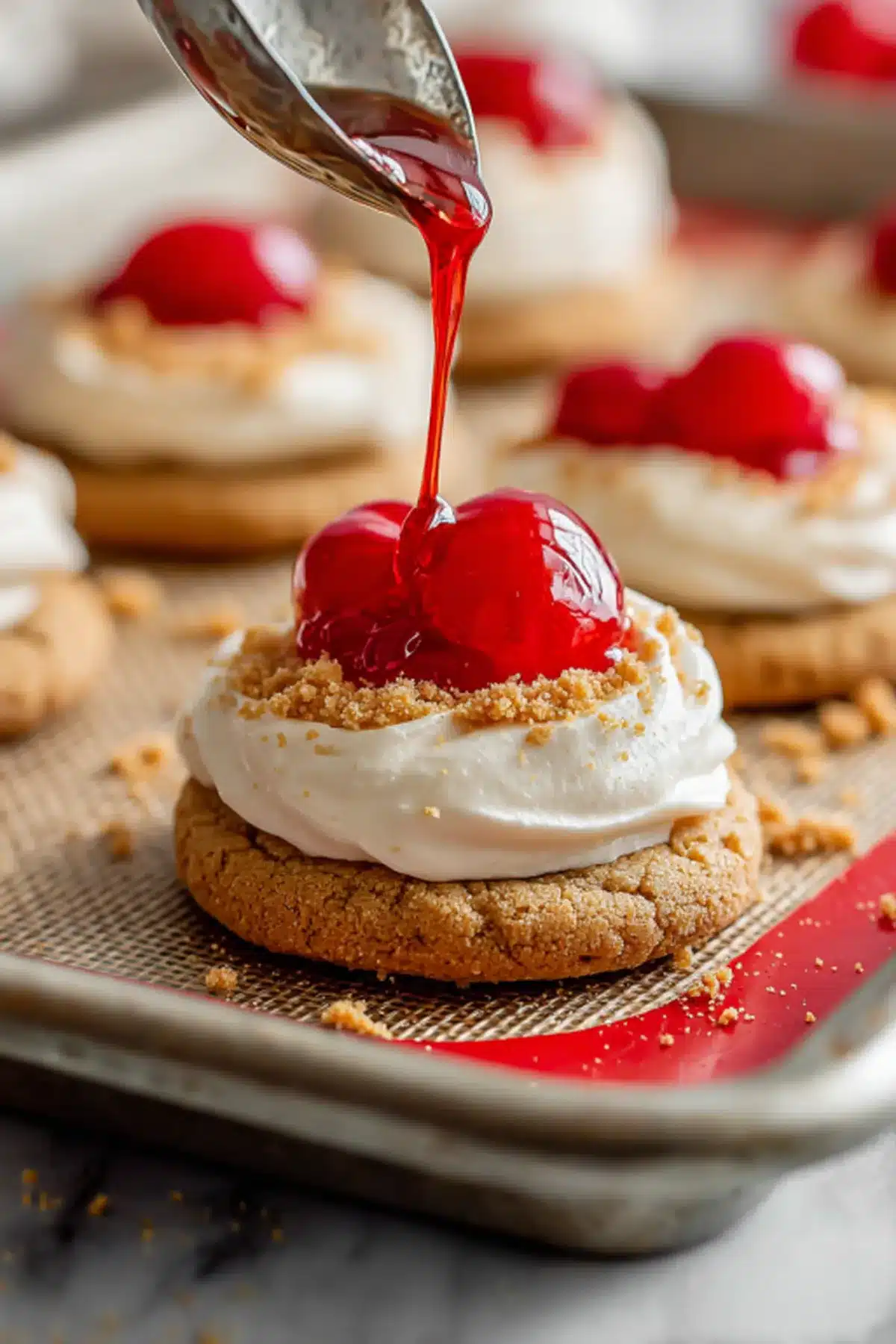 Cool cookies completely before frosting. Store frosted cookies in an airtight container in the fridge for up to 3 days. Dough can be made ahead and frozen. Substitute cherry topping with raspberry or blueberry if desired. For a gluten-free version, use 1:1 GF flour and gluten-free graham crackers.