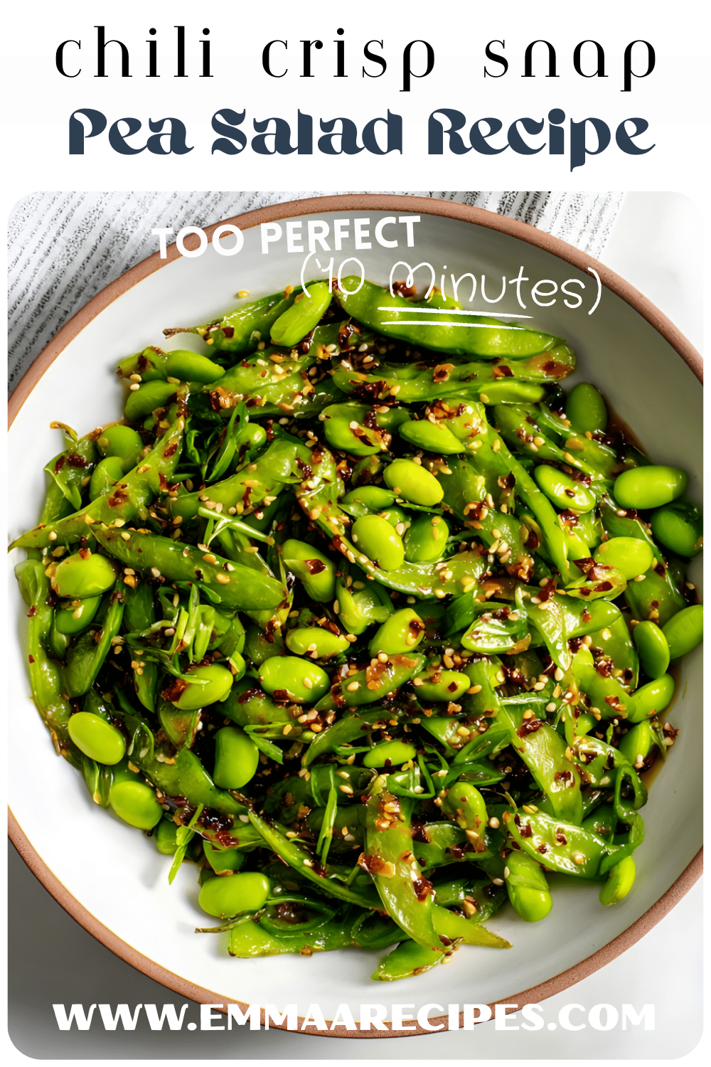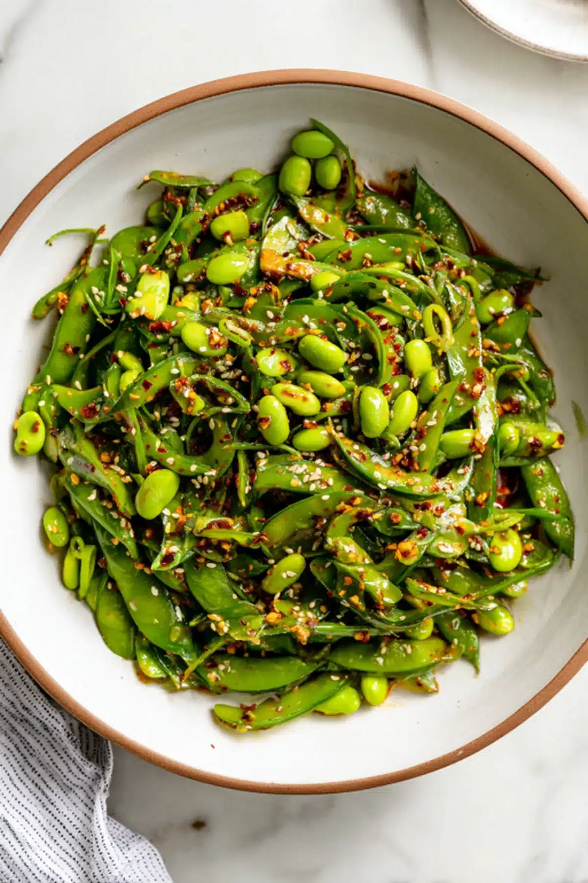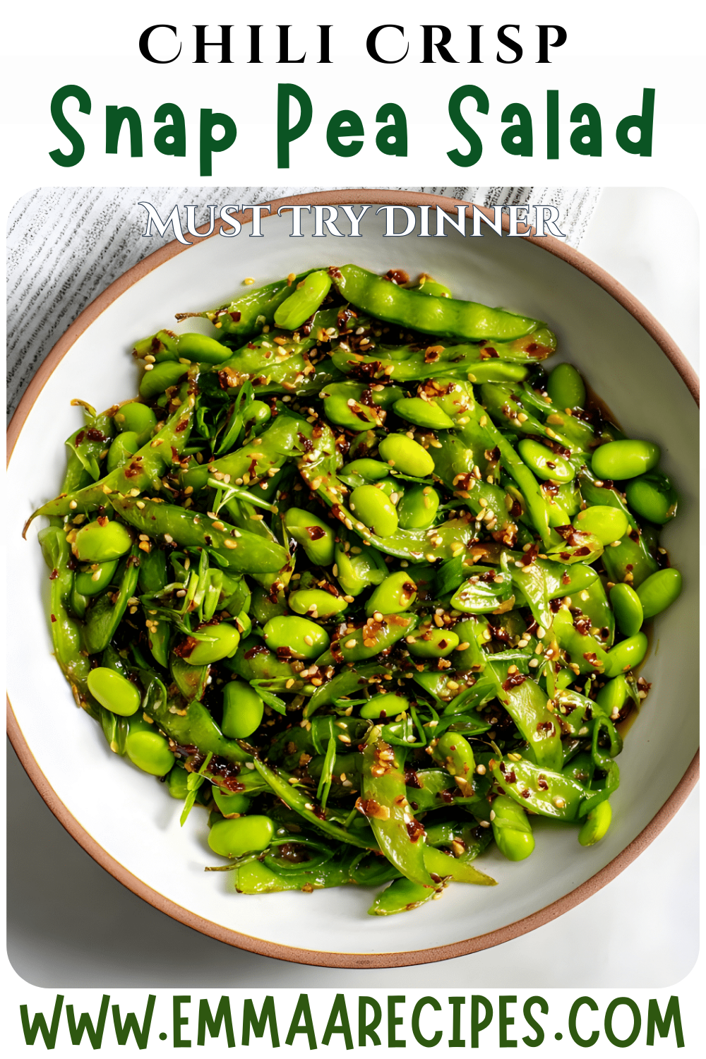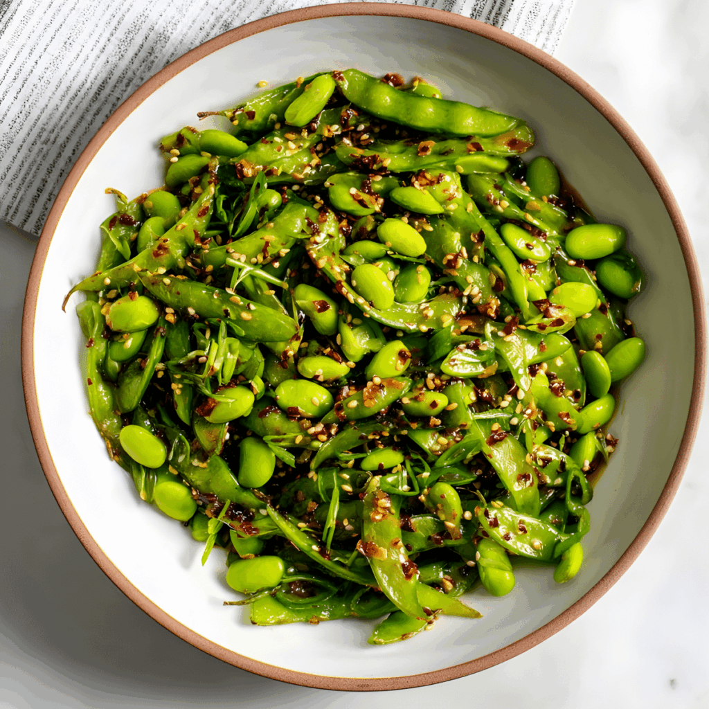 A bright, crunchy Chili Crisp Snap Pea Salad packed with sweet snap peas, tender edamame, fresh herbs, and a warm sesame chili crisp dressing that delivers bold flavor and gentle heat.