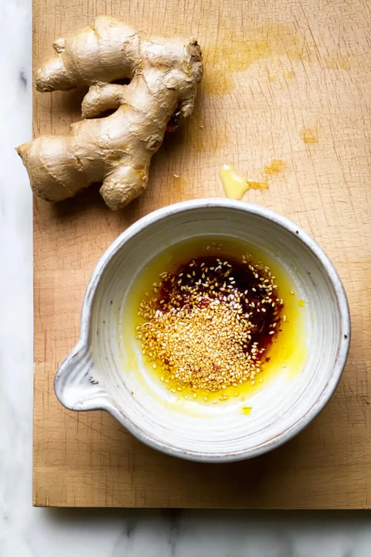 In a heat-proof bowl or jar, combine sesame seeds, honey, grated ginger, and chili crisp.