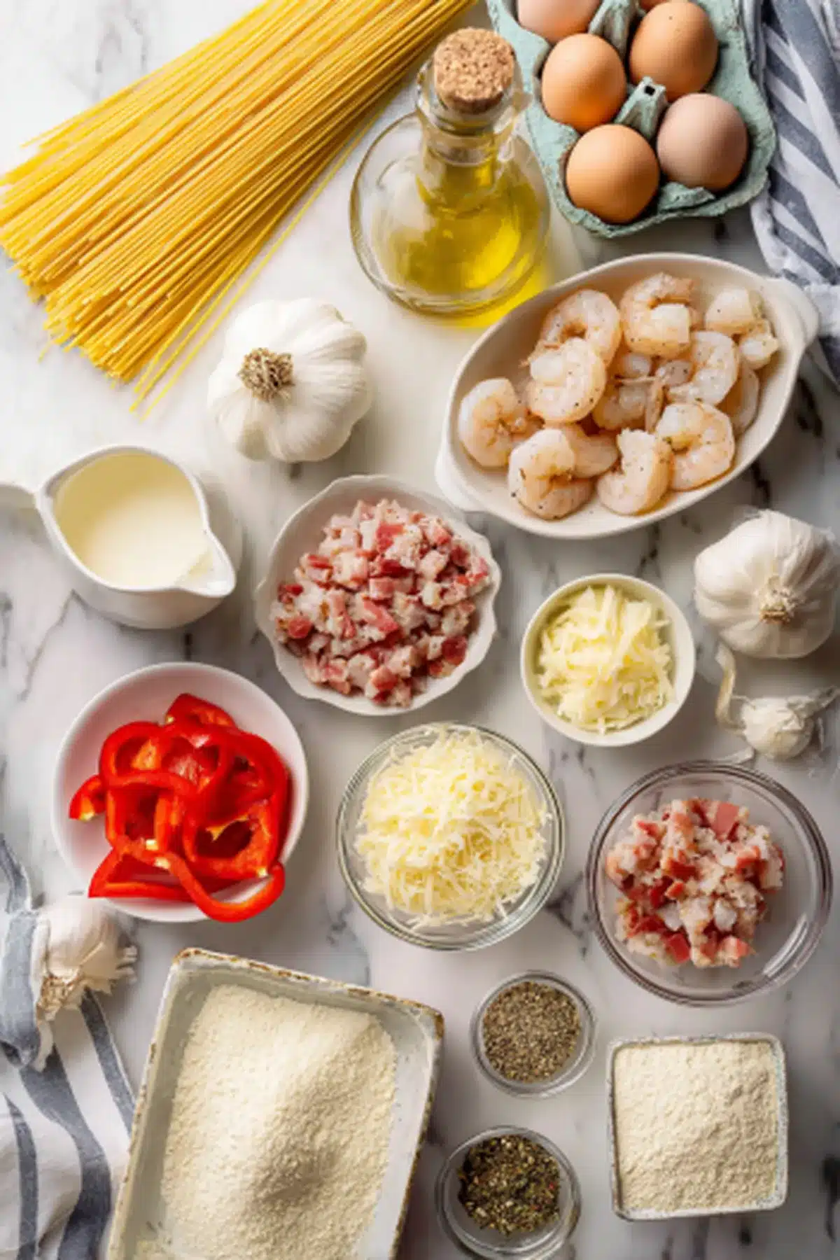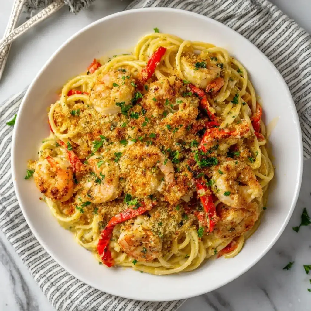 Use raw shrimp for the best texture, and whisk carbonara sauce constantly to avoid curdling. For gluten-free, sub pasta and breadcrumbs.