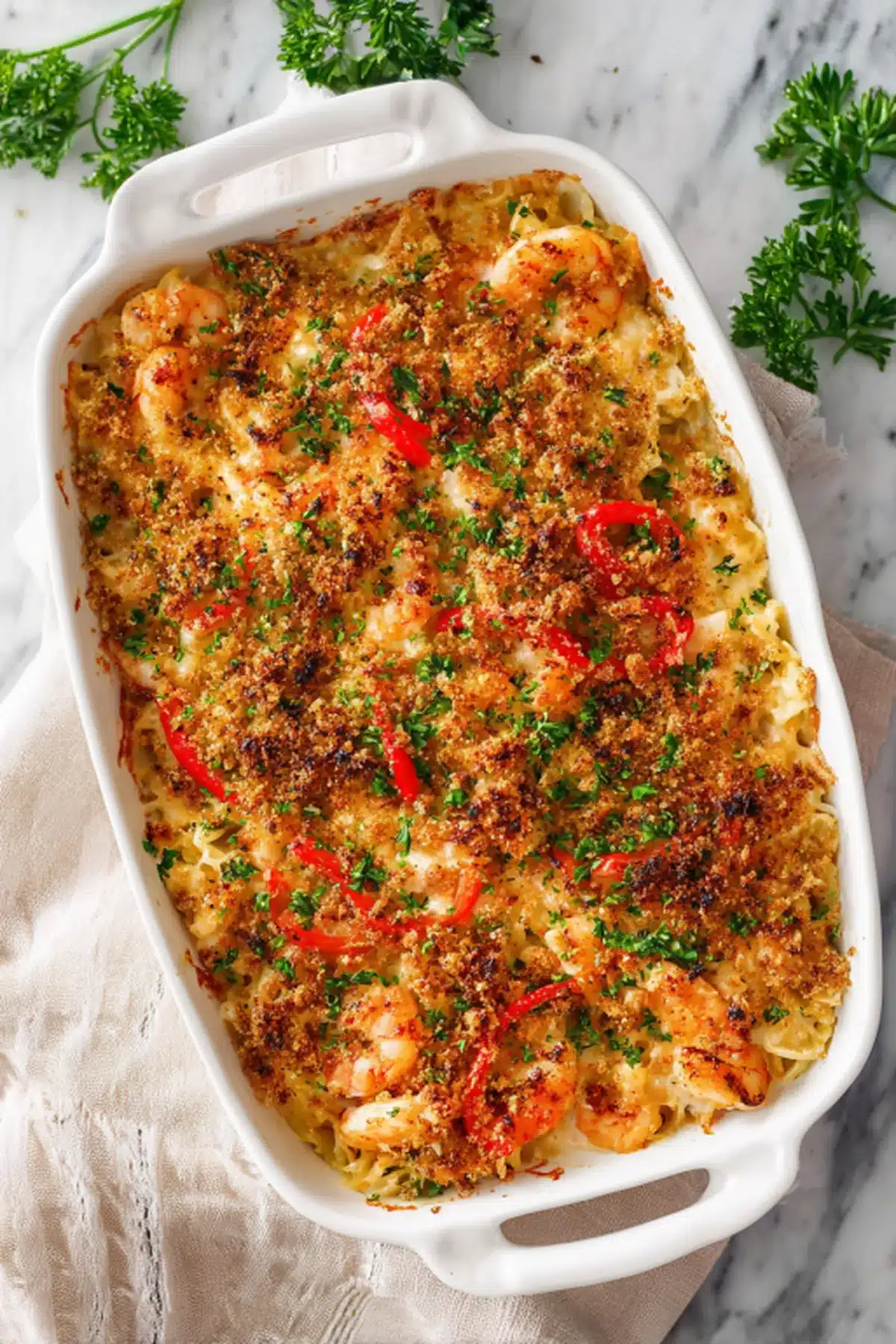 Expect a rich, creamy sauce with smoky pancetta and nutty Parmesan layered over al dente pasta. The shrimp are sweet and juicy, the chicken savory and satisfying. The breadcrumb topping? Buttery, garlicky, and perfectly crisp the final flourish that takes this dish over the top.
