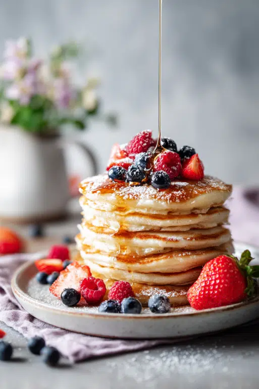 Serve in a warm stack, with berries cascading over the sides like a waterfall of color. A dusting of powdered sugar or mint leaves adds a fresh, brunch-worthy touch.