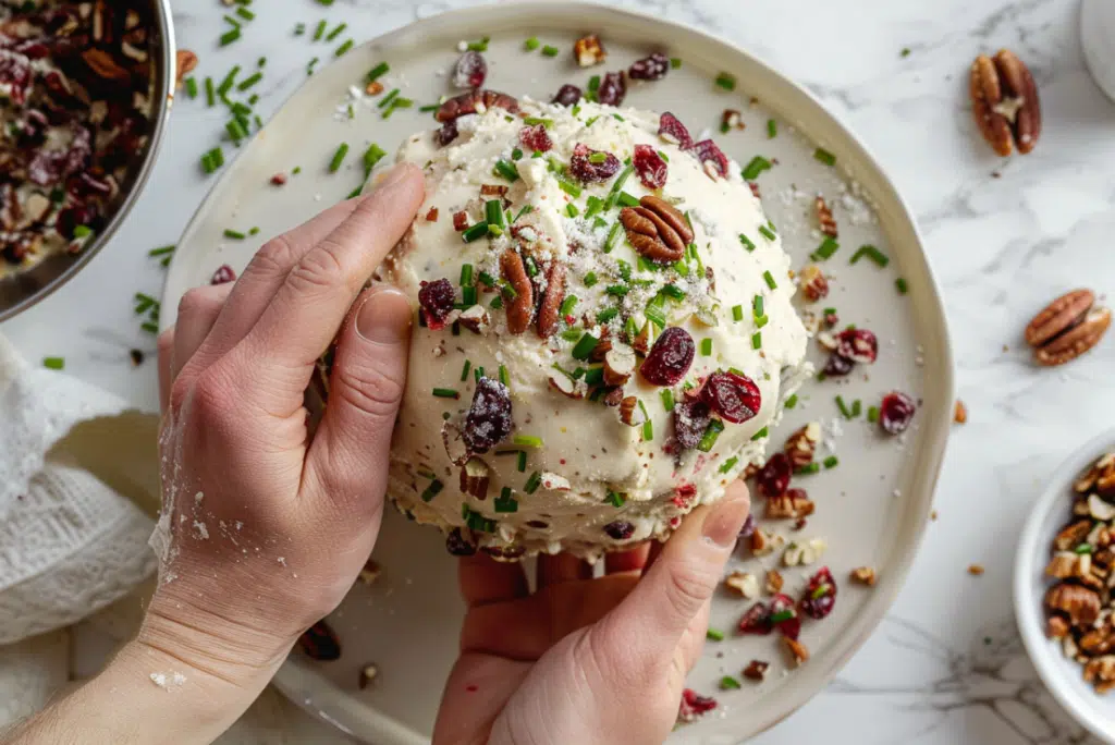 - Once firm, unwrap the cheese ball and roll it gently in the cranberryโpecan mixture, pressing lightly so bits adhere evenly.