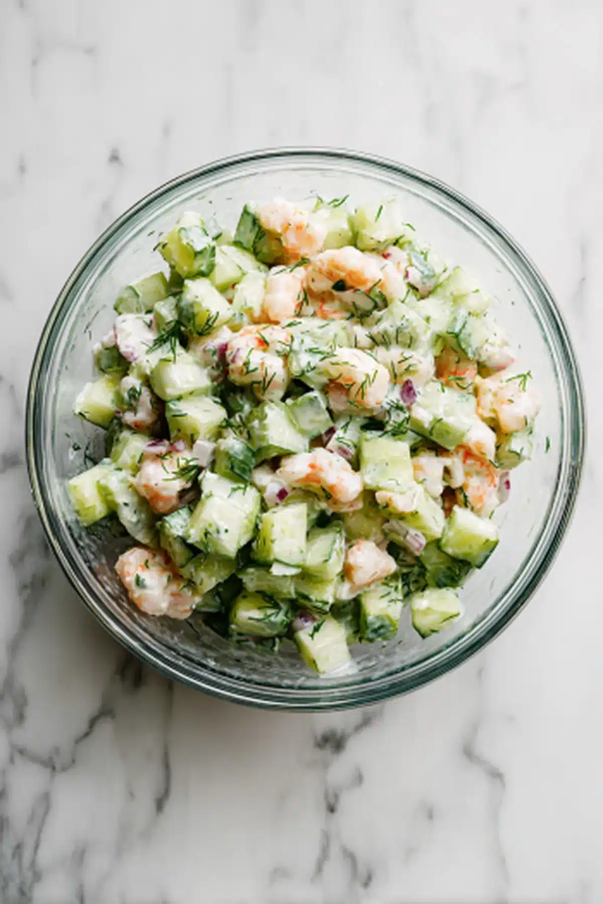 - In a large bowl, combine shrimp, diced cucumber, green onion, and dressing. Stir gently to coat.