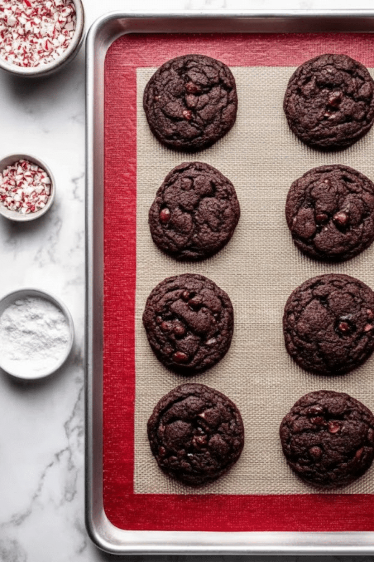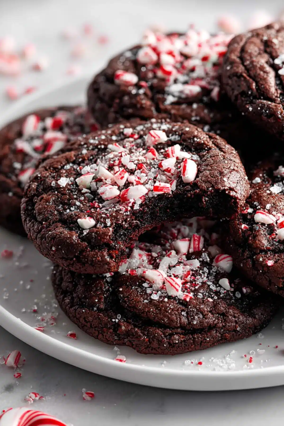 The flavor? Deep, dark chocolate layered with a cooling kiss of peppermint. The texture walks that perfect line between soft and chewy, with a tender middle and just enough crisp around the edges. Crushed candy canes on top add a whisper of crunch and sparkle like edible snow.