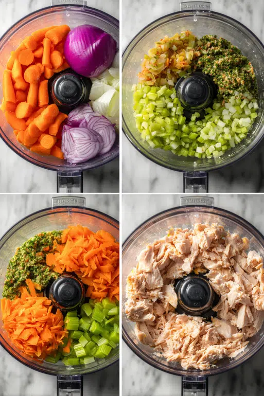 - Add celery, carrot, and red onion to a food processor. Pulse 8-10 seconds until finely minced. Transfer to a large bowl.