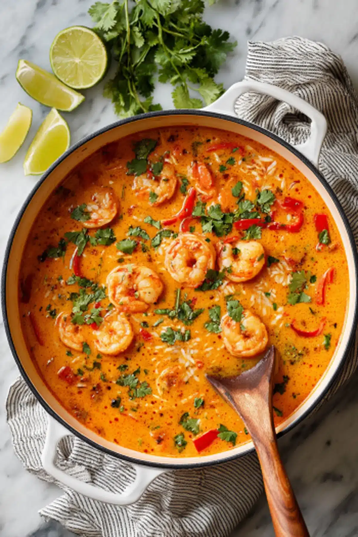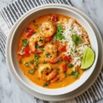 This soup is a flavor bomb coconut milk adds lush creaminess, red curry brings warmth without overpowering heat, and lime juice cuts through with a bright zing. The shrimp are juicy and tender, the rice adds body, and the vegetables offer just the right bite.