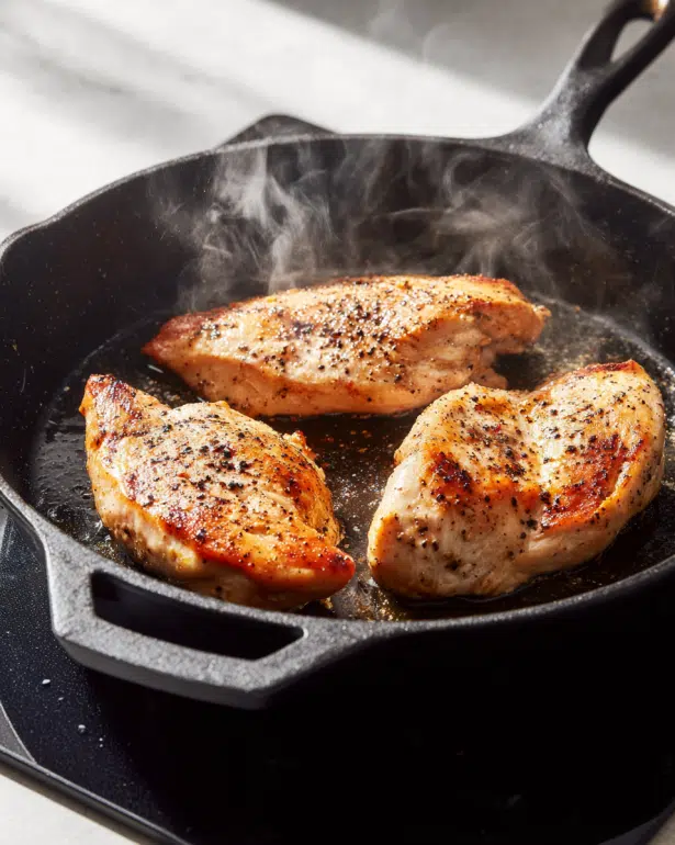 - Sear the chicken: Heat olive oil in a cast iron skillet over medium heat. Once hot, add chicken and sear for 1-2 minutes on each side until golden brown.