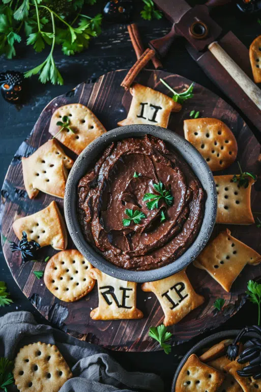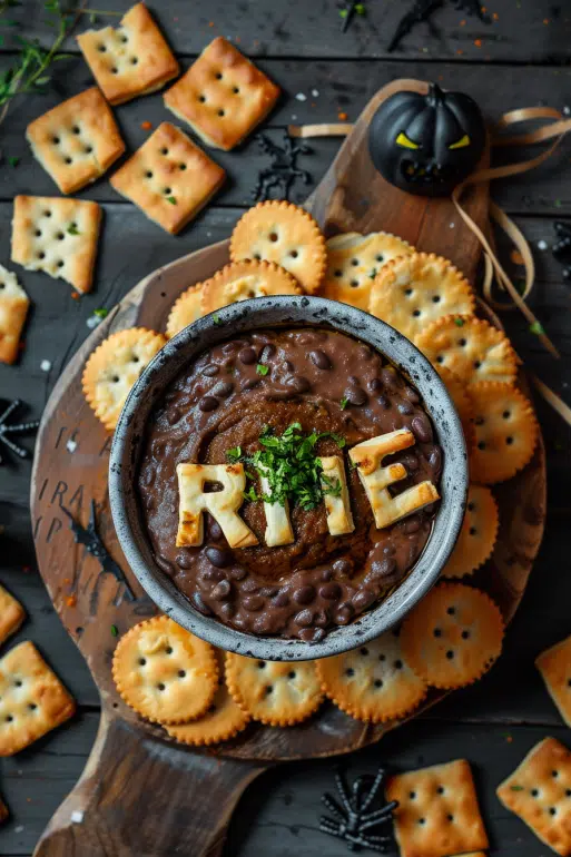 This Halloween Black Bean Dip is creamy, smoky, and hauntingly delicious perfect for spooky gatherings. Topped with flaky puff pastry "RIP" letters, it's as festive as it is flavorful. Serve with crackers or veggies for a ghoulishly good appetizer.