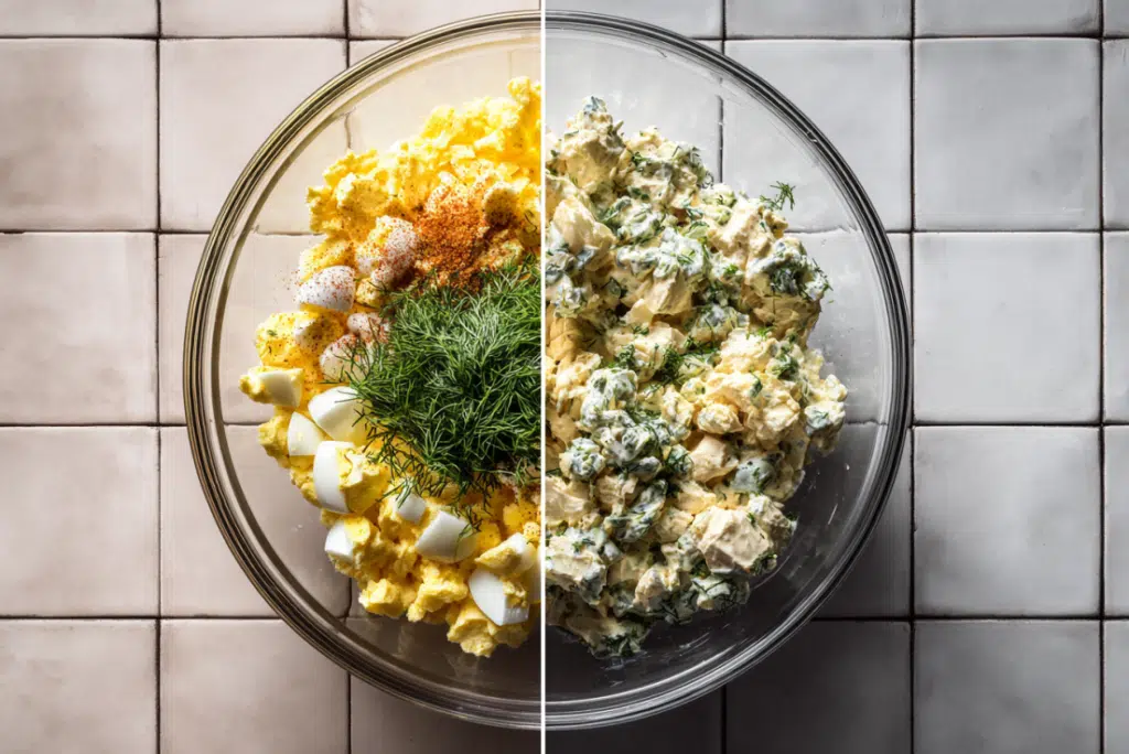 - Add eggs and herbs: Gently fold in the chopped eggs, dill, and chives.