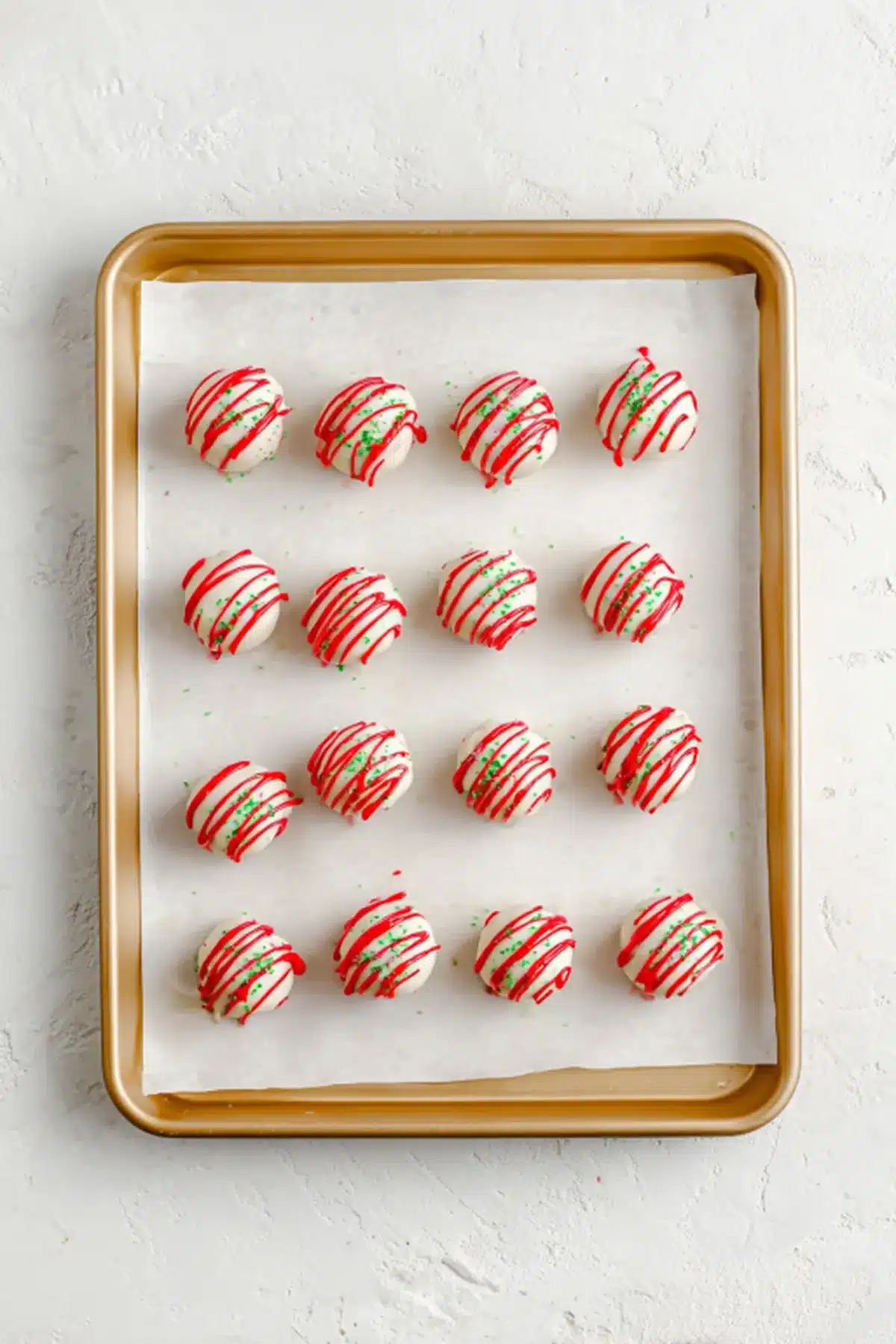 7. Decorate. Immediately top with sanding sugar while the coating is still wet. If using red melted candy, drizzle over using a piping bag or spoon.