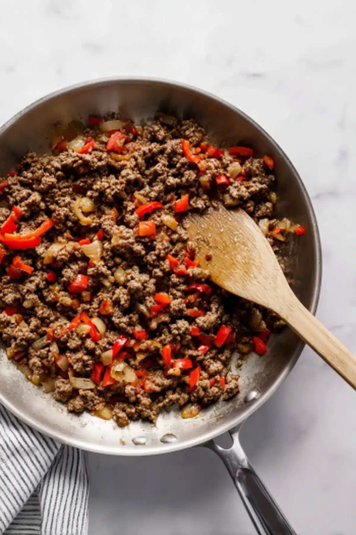 6. Add ground beef, season with salt and pepper, and cook 7-8 minutes until browned