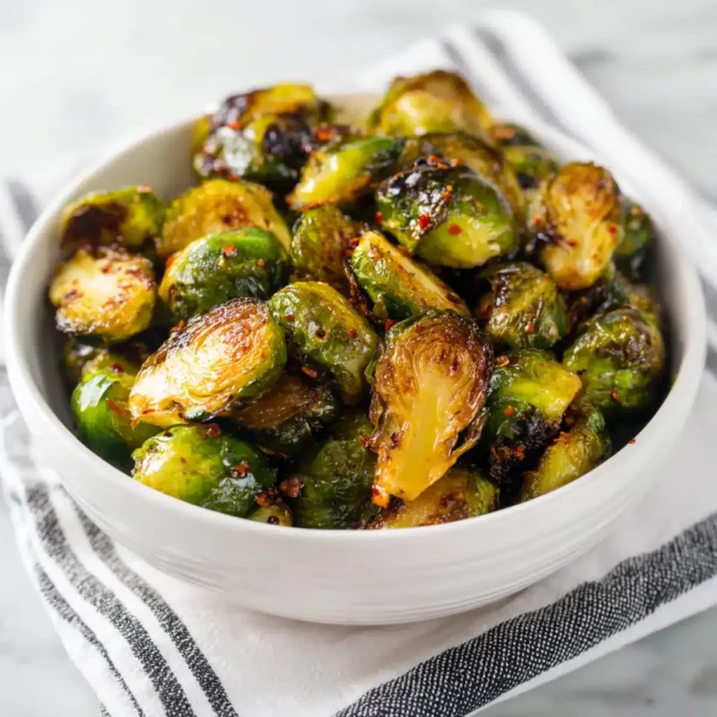 Maple roasted Brussels sprouts deliver the perfect mix of sweet caramelized edges and savory depth, roasted to crispy-tender perfection with a hint of heat.