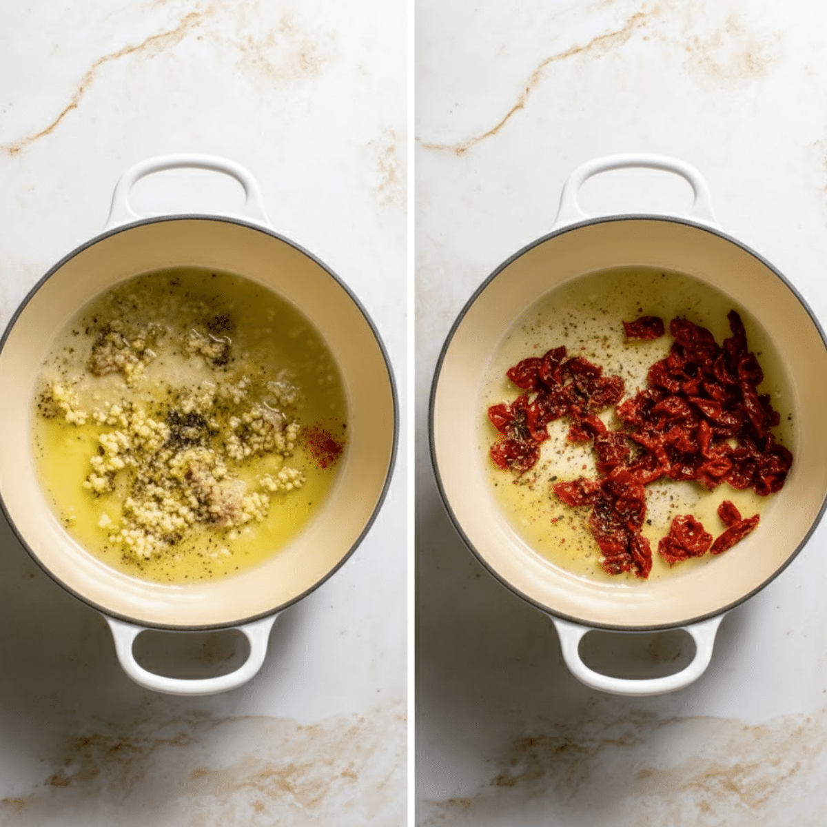 Return skillet to medium heat. Add 1 Tablespoon reserved sun-dried tomato oil. Stir in garlic and cook until fragrant, about 30 seconds. Add tomato paste and cook 1 minute. - Deglaze the Pan