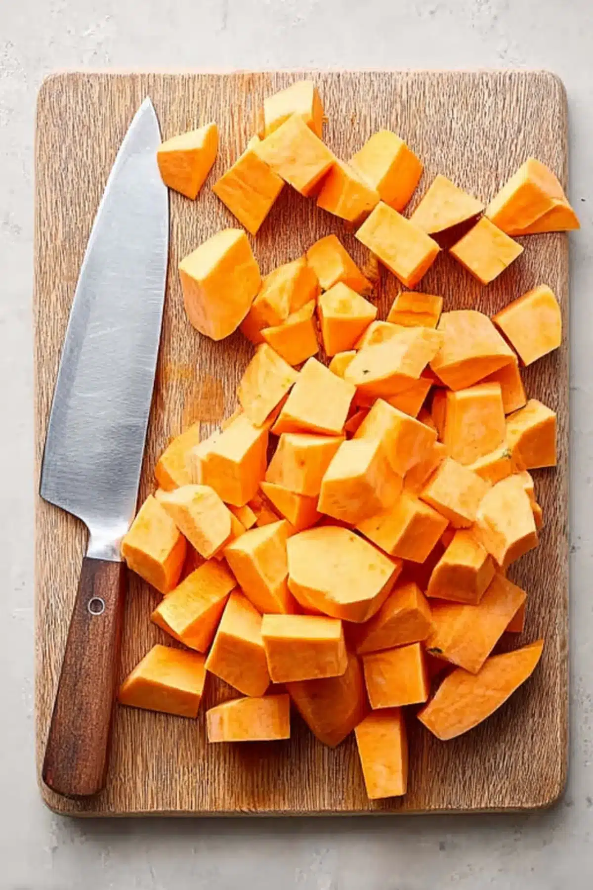 - Slice the Potatoes: Peel the sweet potatoes using a hand peeler. Cut them into 1 to 1 ½-inch chunks for even cooking.