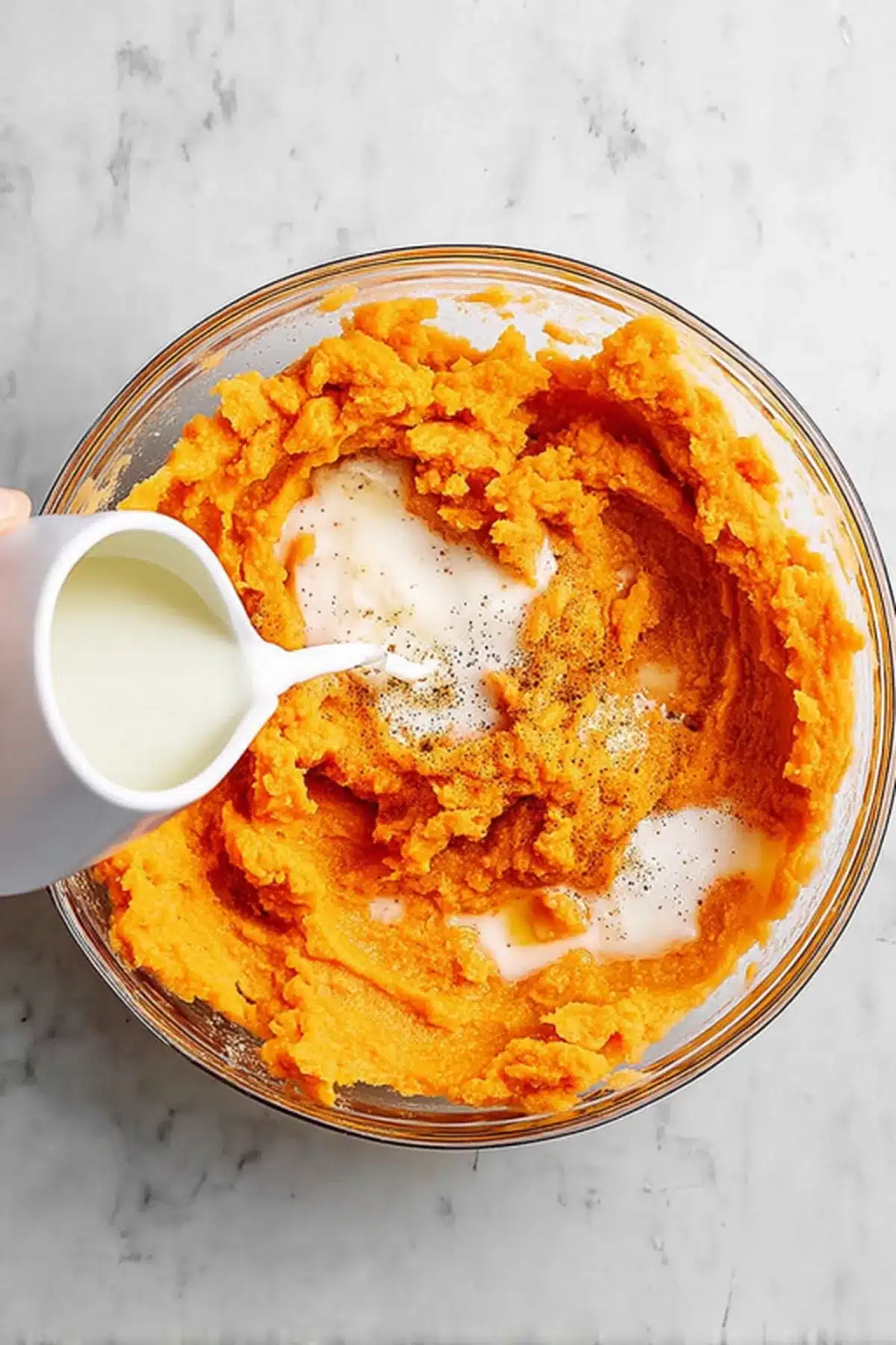 - Mix: Pour in the melted butter and milk. Stir until silky smooth. Season with salt and pepper.
