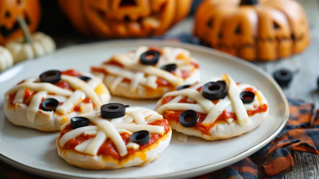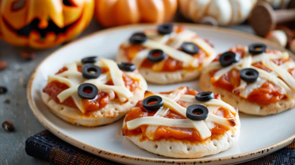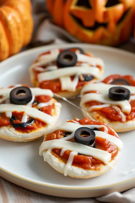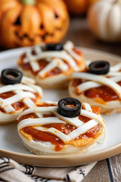 Mini Mummy Pizzas are a spooky Halloween snack made with English muffins, pizza sauce, mozzarella "bandages," and olive eyes. Quick, fun, and kid-friendly perfect for parties or family movie nights.