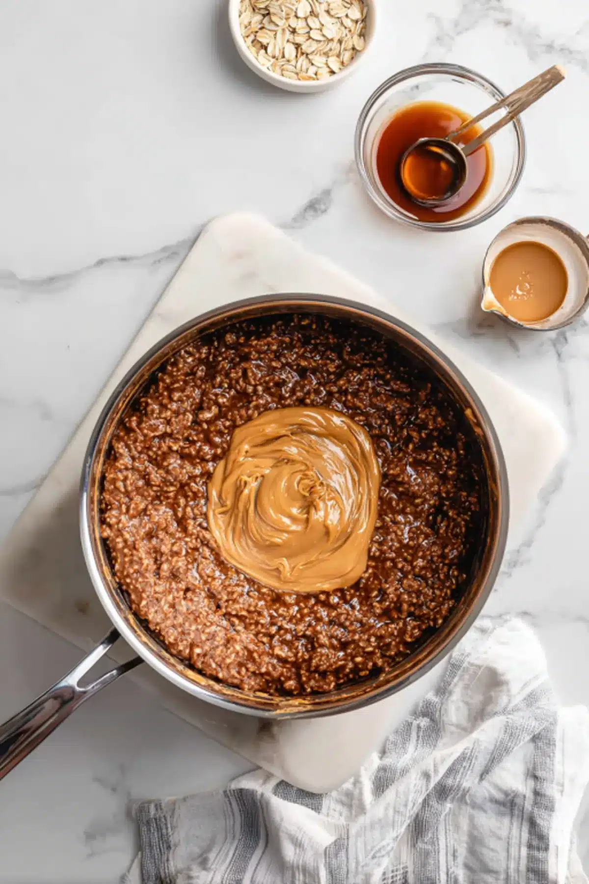 - Stir in oats: Add 3 cups quick oats, mixing thoroughly.