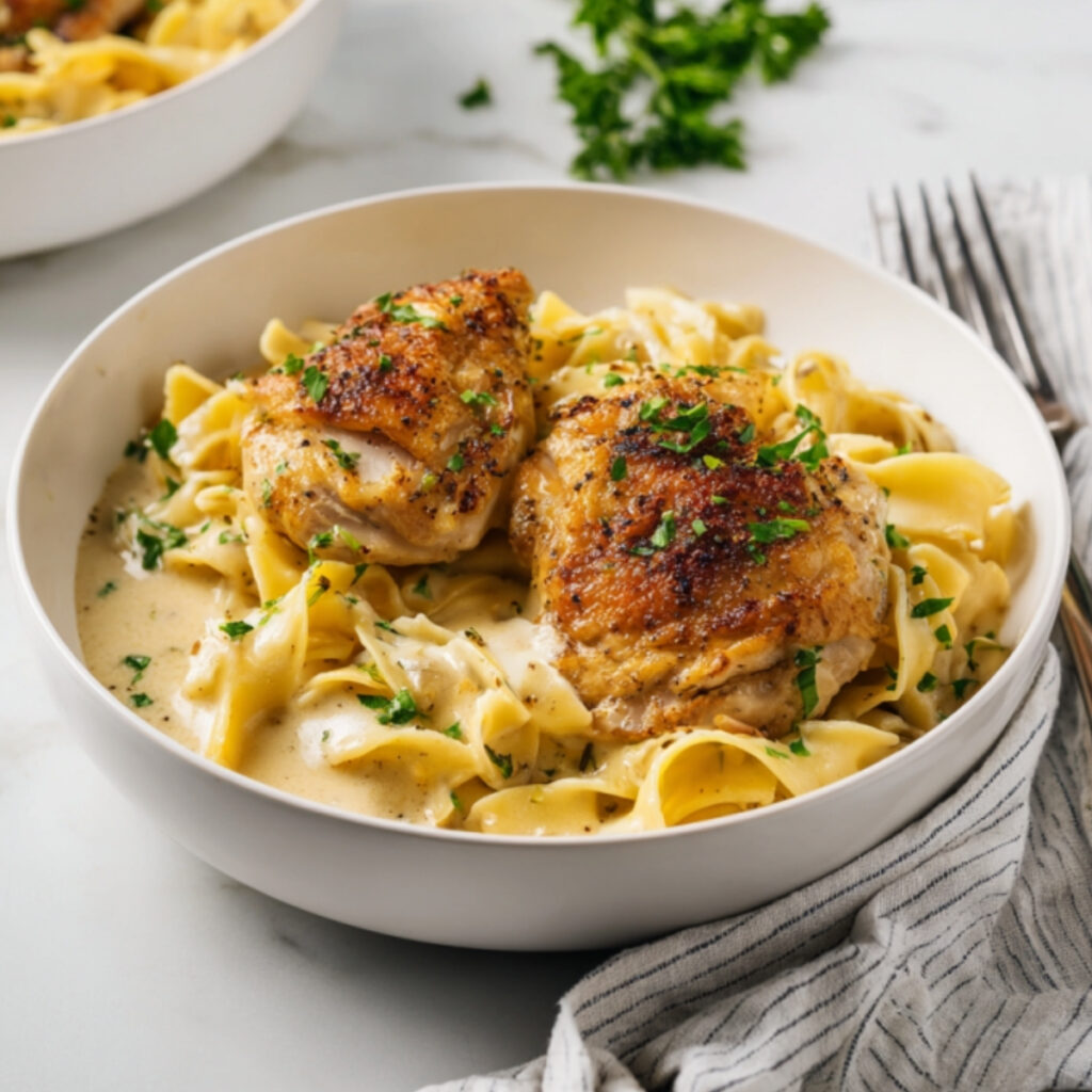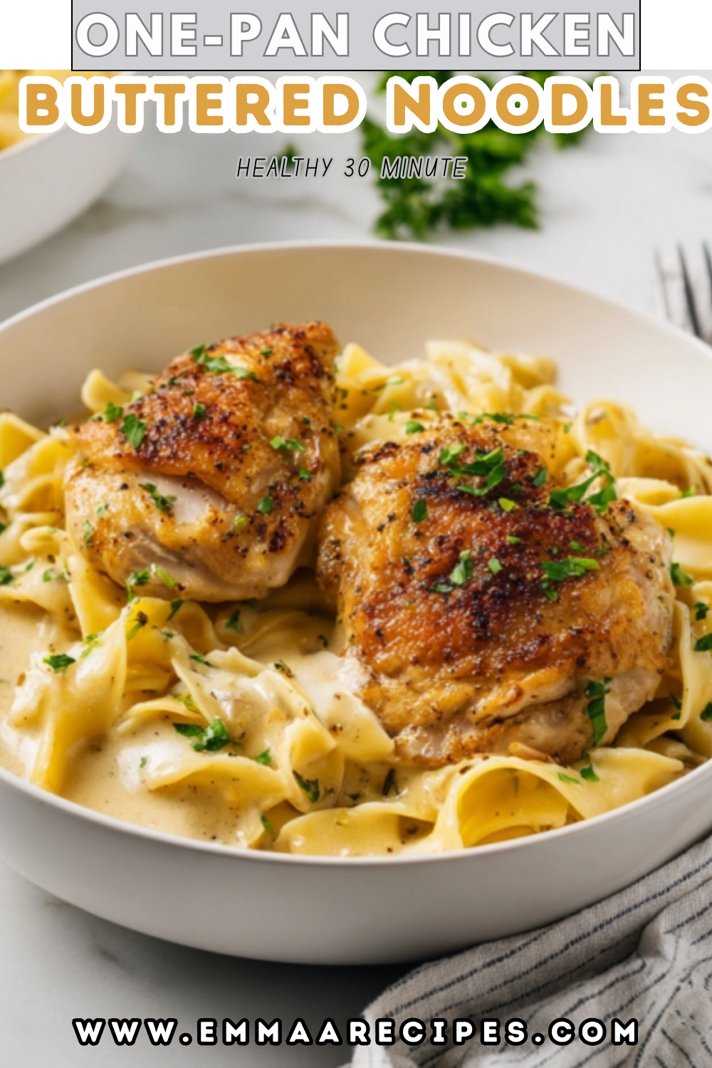 One-Pan Chicken with Buttered Noodles is a cozy, comforting dinner made with golden-seared chicken thighs, tender egg noodles, garlic, butter, and Parmesan all simmered together in one pan for an easy, satisfying meal.