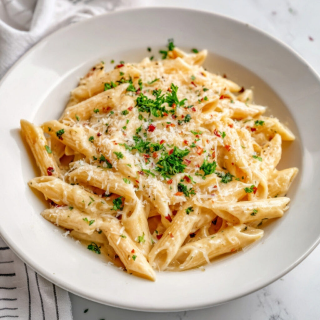 One Pot Creamy Garlic Pasta even the name feels like comfort. A silky, velvety cream sauce infused with gentle garlic warmth and melted Parmesan, wrapping every curve of pasta in pure cozy goodness.