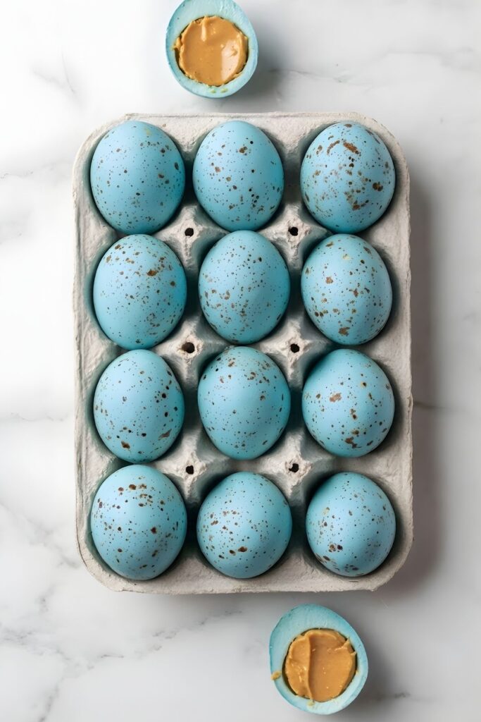 Peanut Butter Easter Eggs are a creamy no-bake spring treat made with natural peanut butter, maple syrup, and almond flour, then dipped in robin's egg blue white chocolate and finished with cocoa speckles. They're smooth, sweet, and perfect for Easter baskets, dessert tables, or homemade holiday gifts.