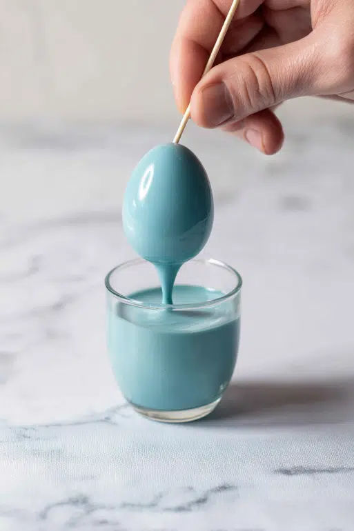 10. Insert a toothpick into a chilled egg and dip into the melted chocolate.