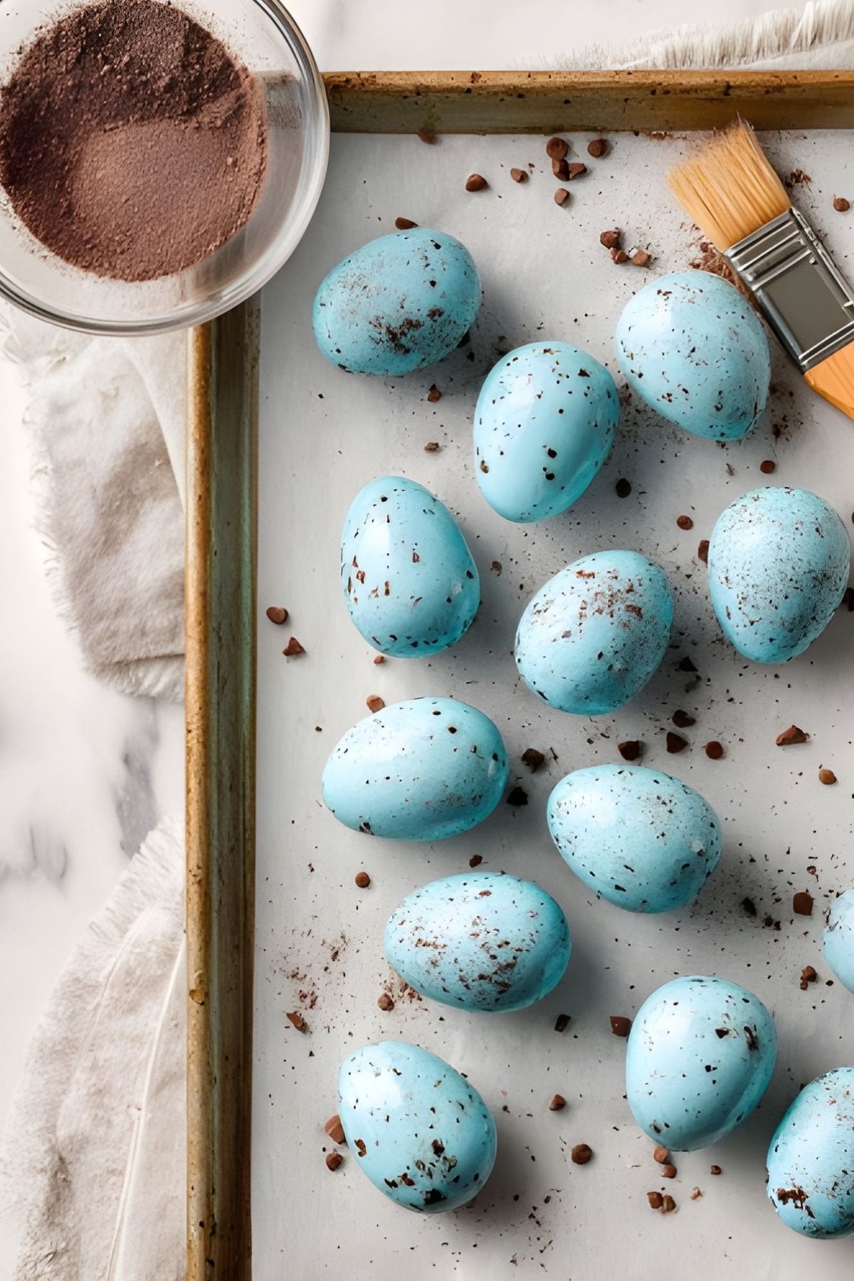 13. Dip a pastry brush in the cocoa mixture and flick speckles over the eggs.