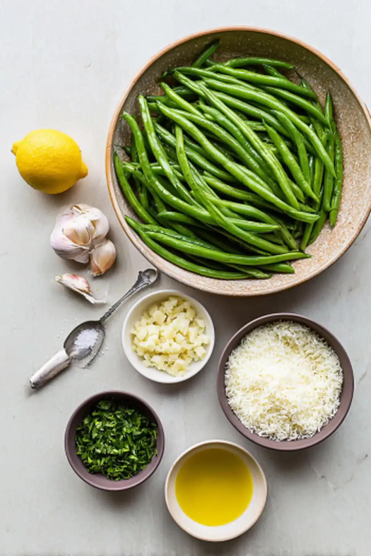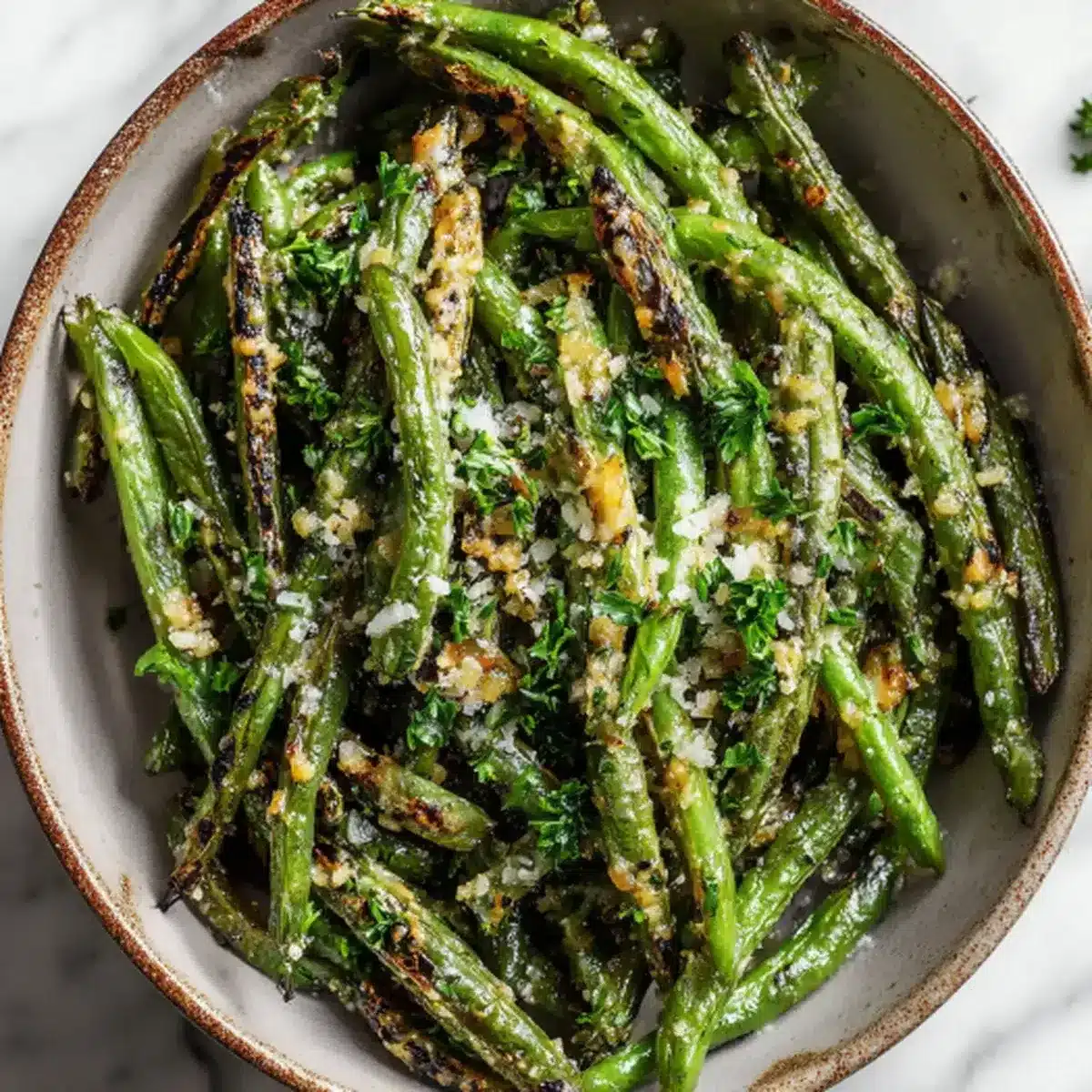Roasted at high heat, these green beans blister slightly, caramelizing at the tips while staying tender-crisp inside. The garlic mellows and sweetens in the heat, the parmesan melts and crisps like golden lace, and a final drizzle of lemon makes everything pop with brightness.