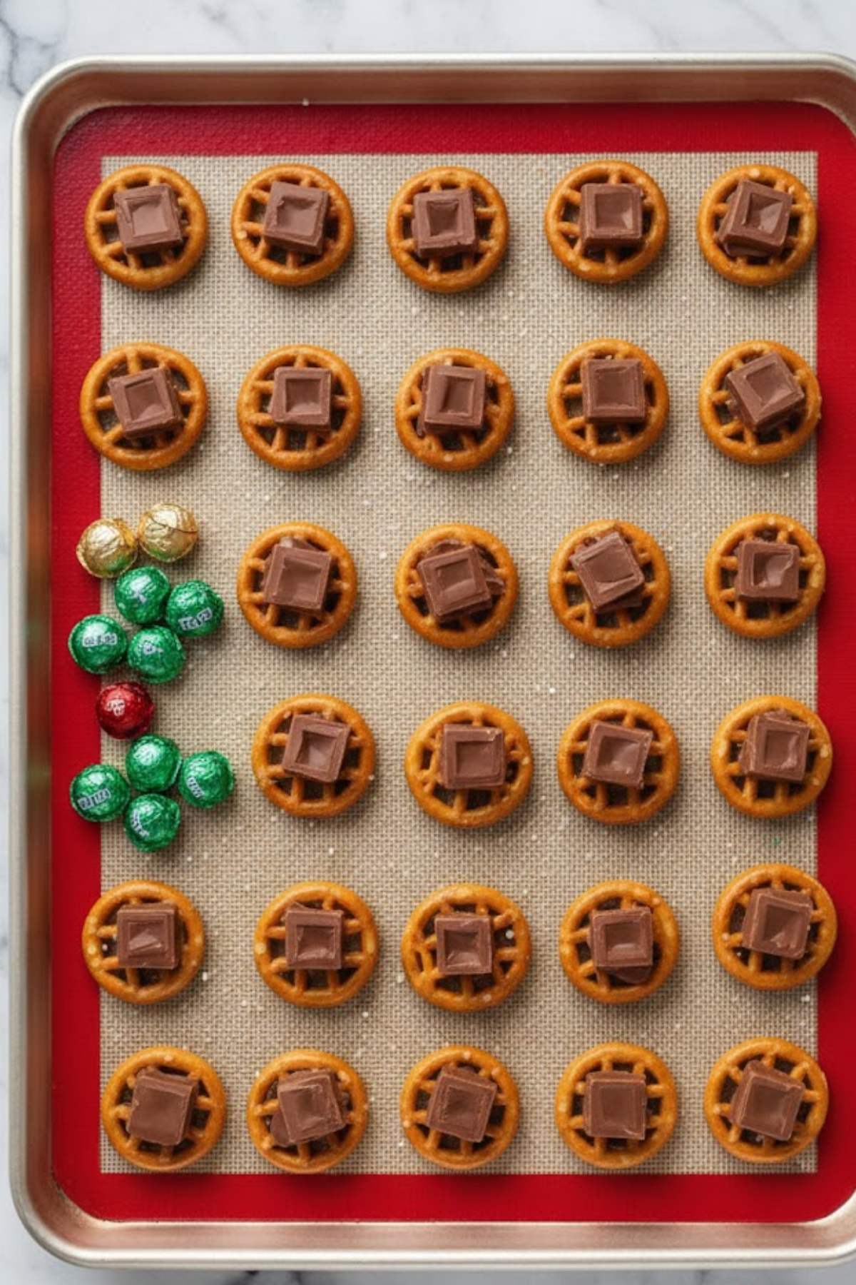 3. Arrange 30 pretzels on the sheet in a single layer.