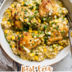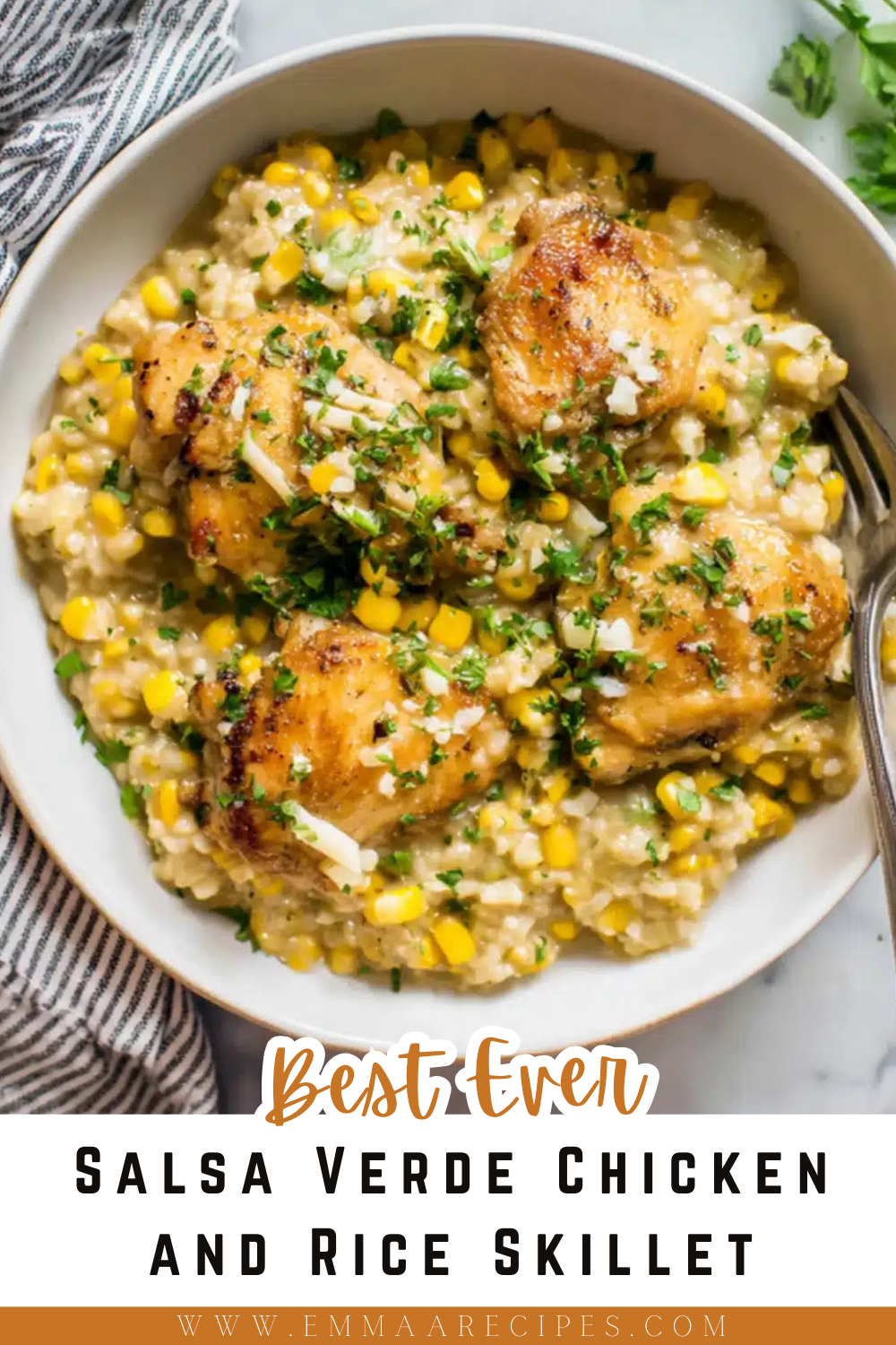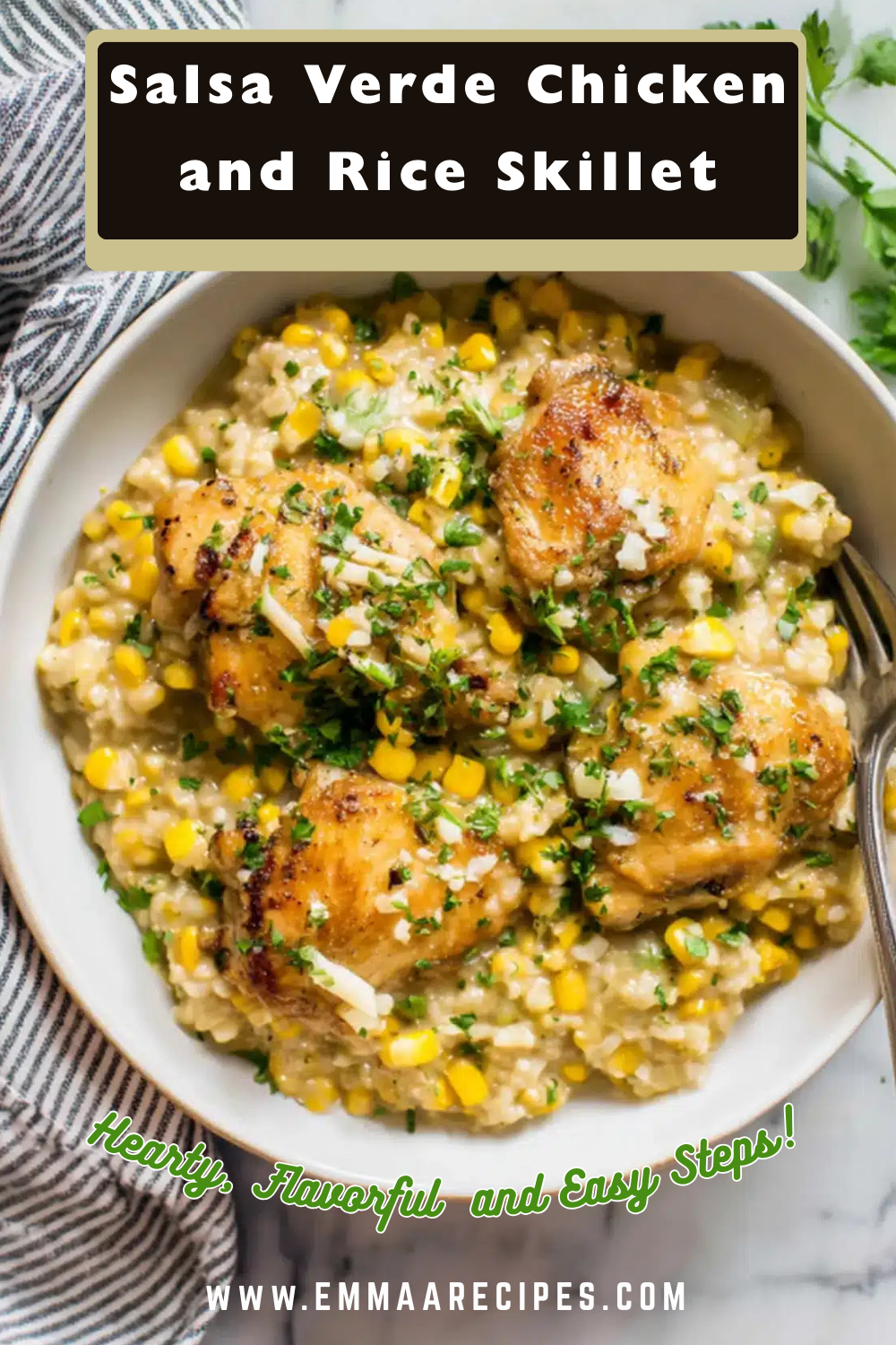 Salsa Verde Chicken and Rice Skilletย a bright, savory one-pan dinner with golden seared chicken thighs, fluffy rice, sweet corn, and melty Colby Jack, all simmered in vibrant salsa verde.