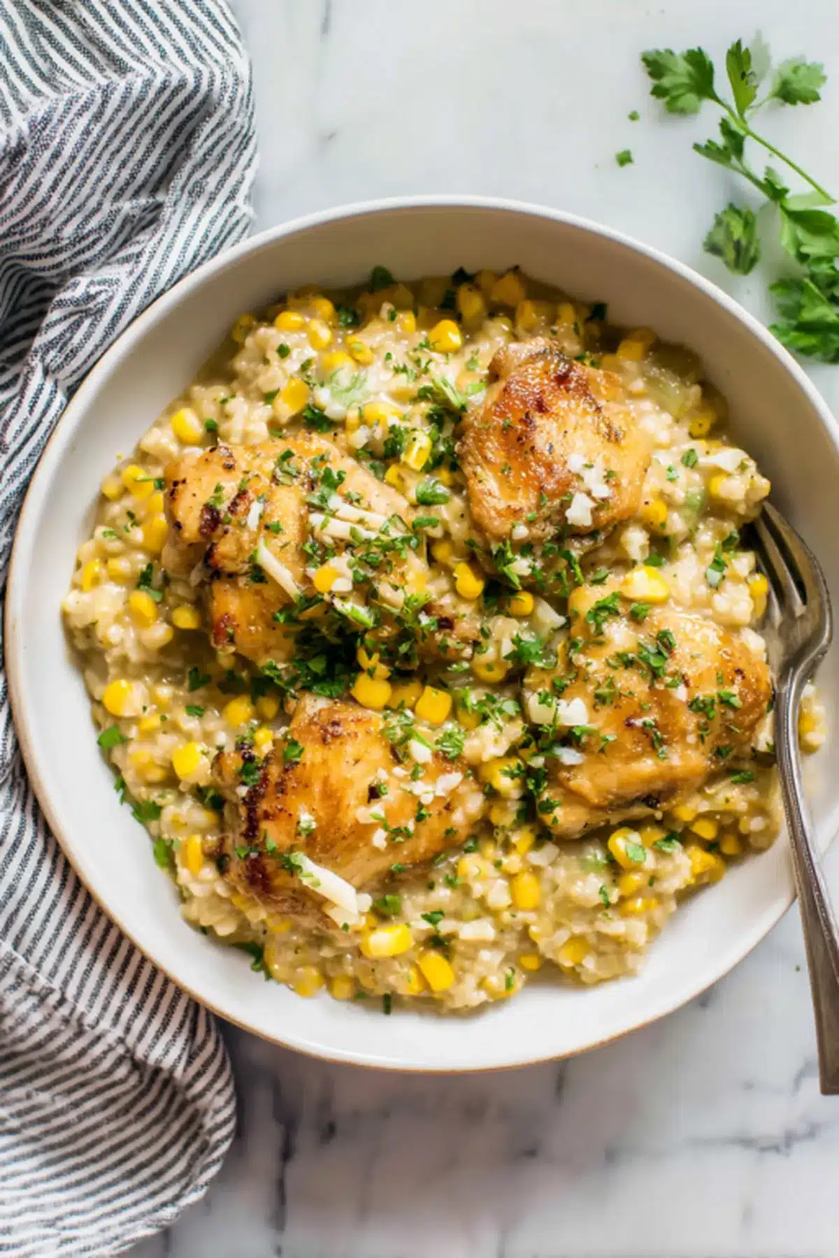 Transfer chicken to a plate. Pour in the broth and scrape up all those beautiful browned bits. - Add rice, salsa verde, and corn.