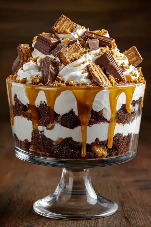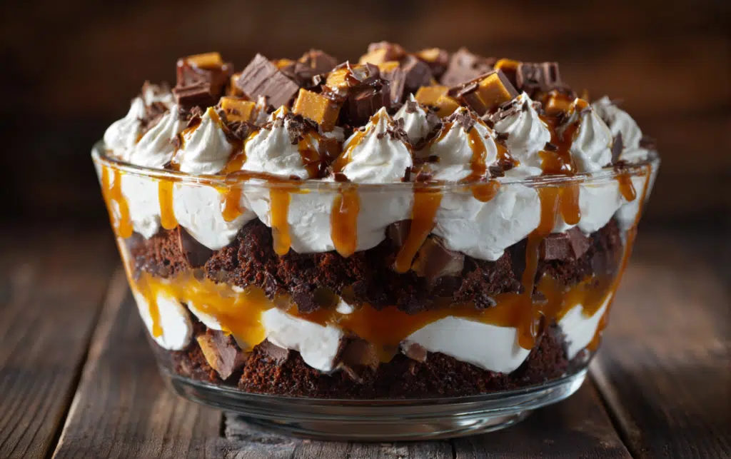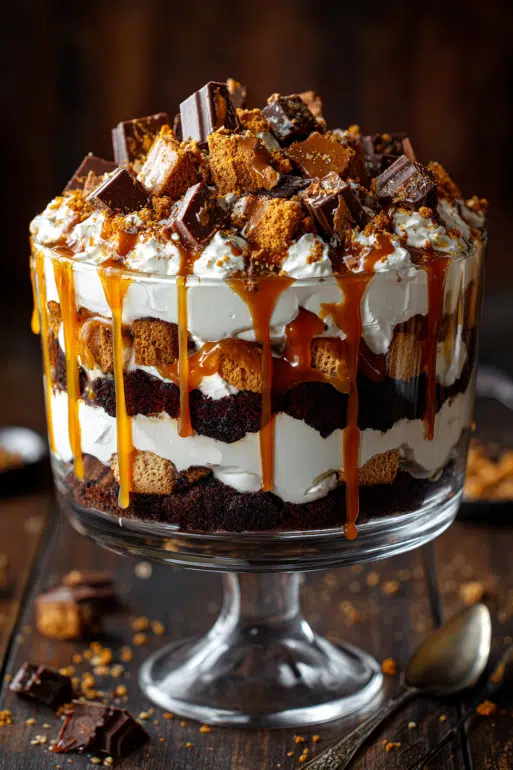 A rich, layered dessert featuring Devil's Food cake, caramel, whipped cream, and toffee bits simple to assemble, stunning to serve, and utterly irresistible.