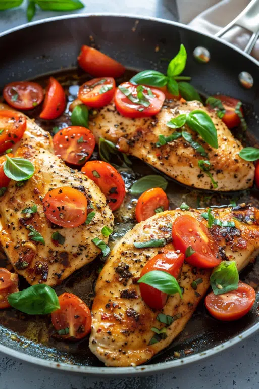 - Finish the dish. Nestle chicken back into the skillet, tucking pieces between the tomatoes. Sprinkle with fresh basil or parsley.