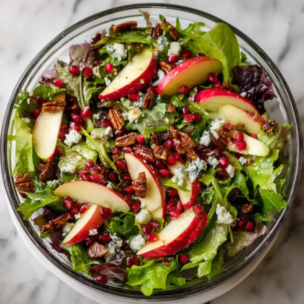 A crisp, colorful celebration of fall, this Thanksgiving Salad is packed with seasonal favorites like apples, pomegranate seeds, blue cheese, and candied pecans, all tossed in a sweet-tart vinaigrette.